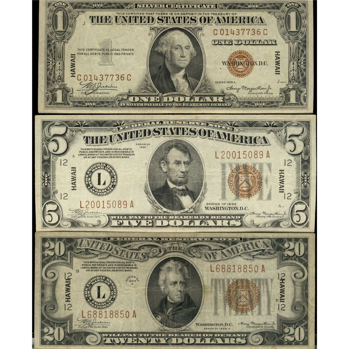 USA: 1935 Hawaii $1 F-2300, $5 F-2301 & $20 F-2305. Lot of 3 notes Fine to VF+.