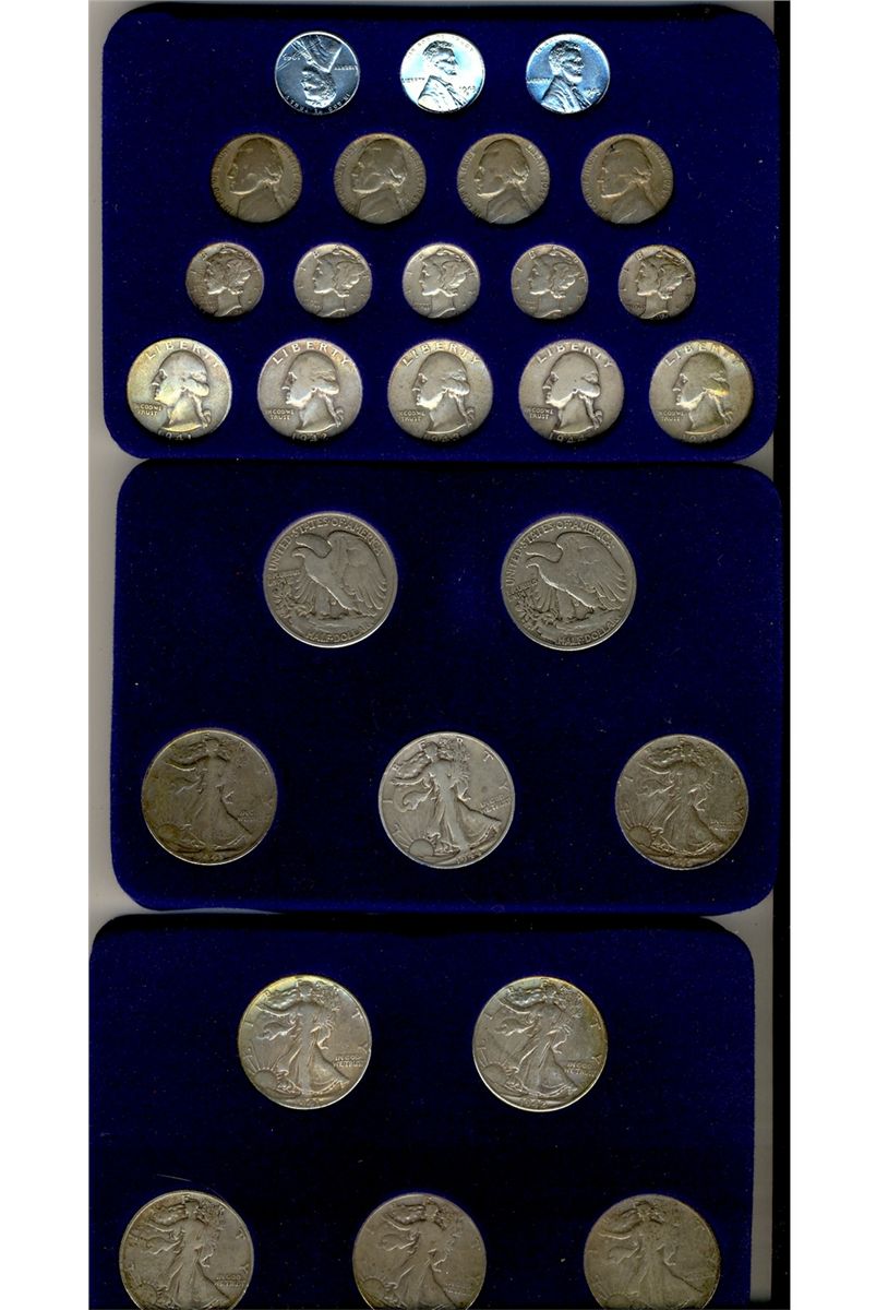 USA 1941 - 1945 World War II Coin Colections. Lot includes 3 sets in blue velvet casings. First set includes 17 pcs 1943 1¢ to 1945 25¢ with 2 sets of US halves 1941 - 1945. Coins grade VG to VF. ($6.75 Fc silver)