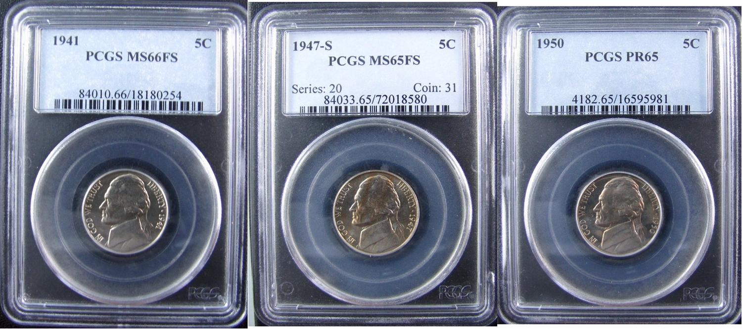 USA 1941 5¢ MS66FS, 1947-S MS65FS & 1950 PR65. Lot of 3 PCGS graded coins.