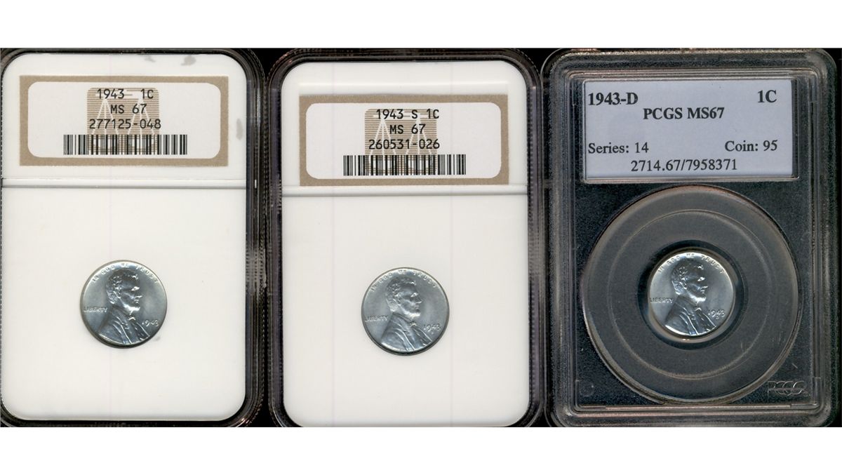 USA  1943 1¢ MS67.  Lot of 3 coins includes 1943, 1943S & 1943D with 2 NGC and 1 PCGS graded.