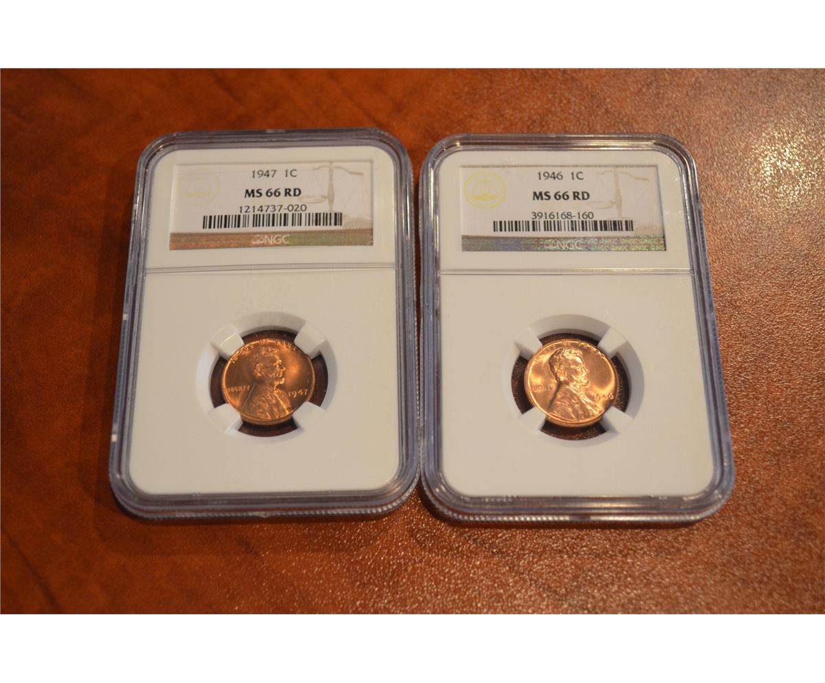 USA; 1946 1¢ & 1947 NGC MS66. (Both Red) Lot of 2 coins. Value $500(US)