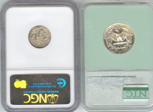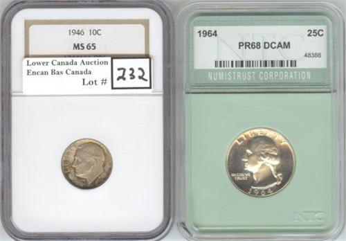 1946 Roosevelt dime NGC certified MS-65; 1964 25 cent NTC certified PF-68