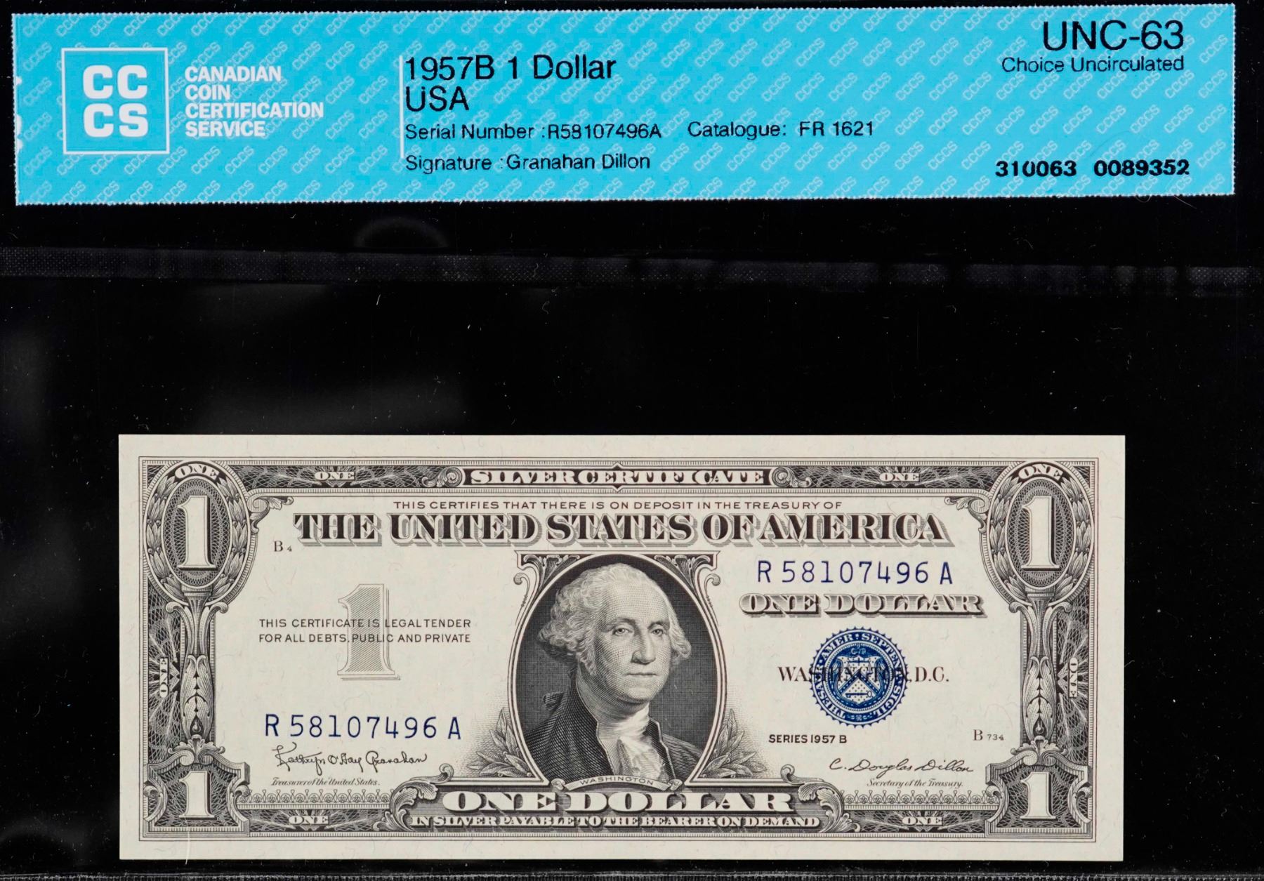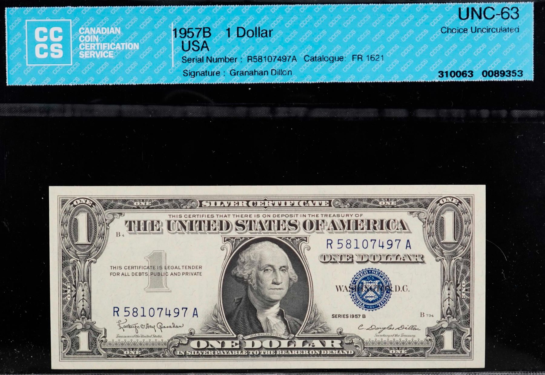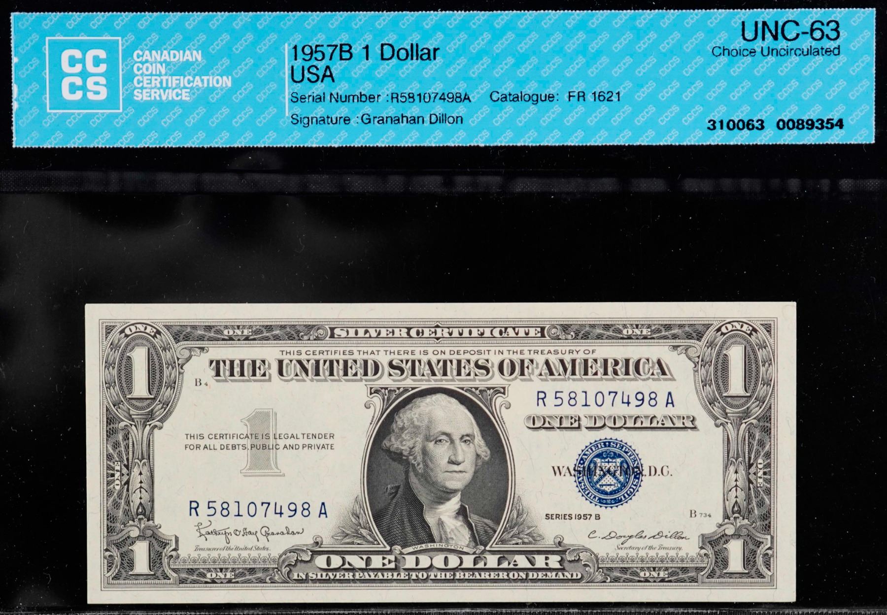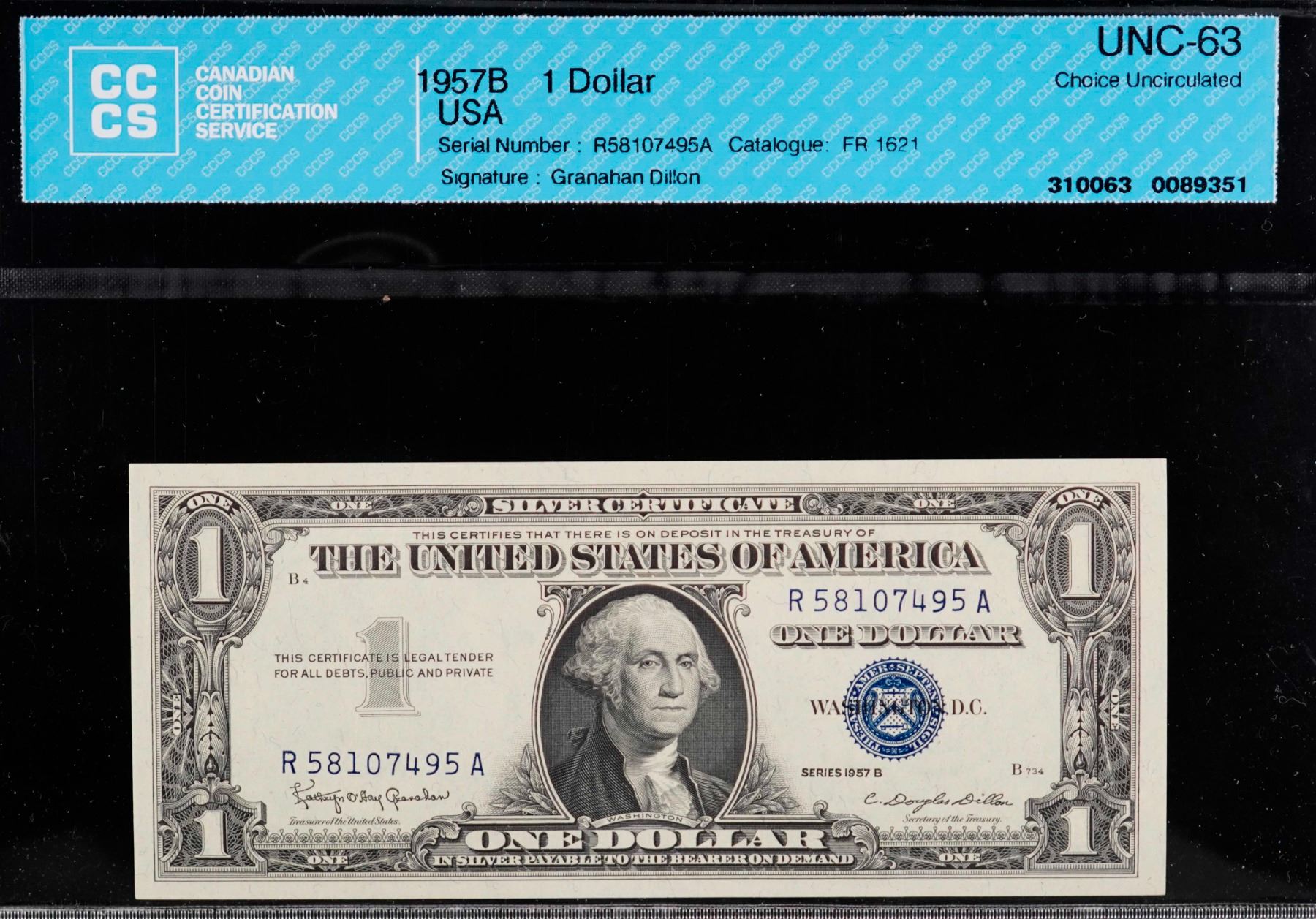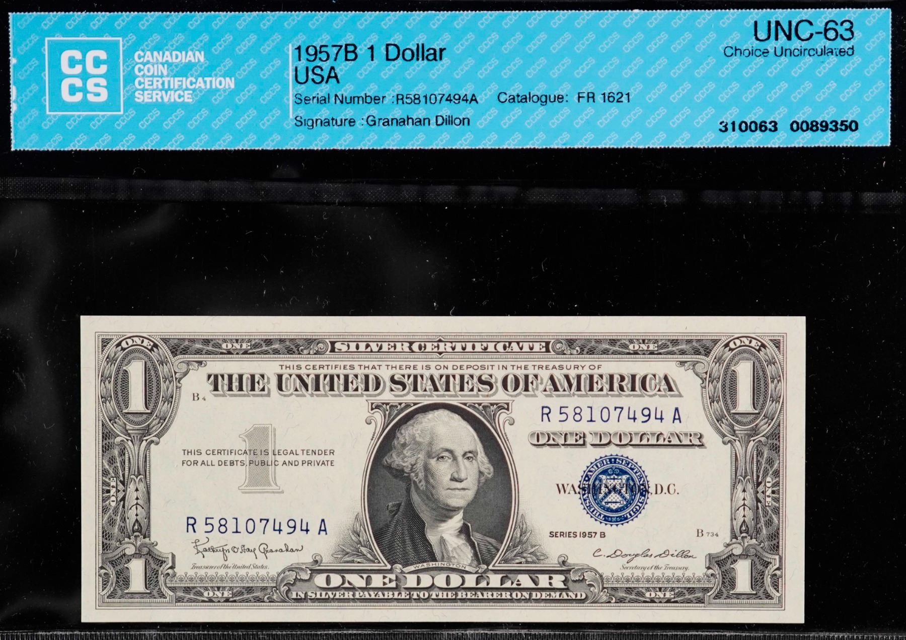 USA; 1957B $1 FR;1621 #R58107494A-7498A - Granahan Dillon. Lot of 5 consecutive notes CCCS UNC63
