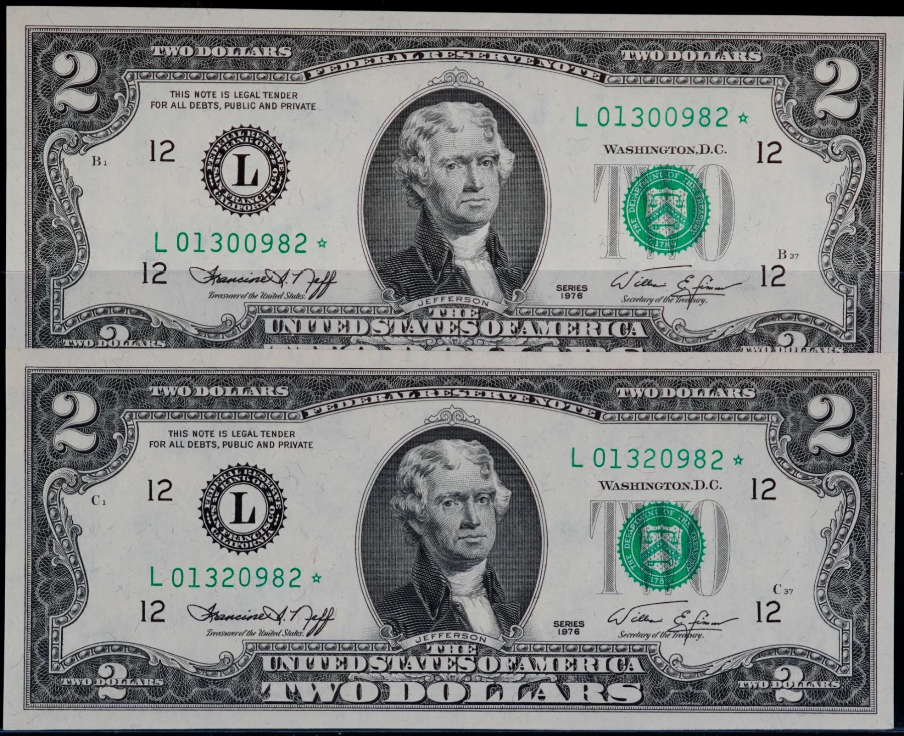 USA 1976 $2 #L01300982*-L01320982*, both Unc or better.