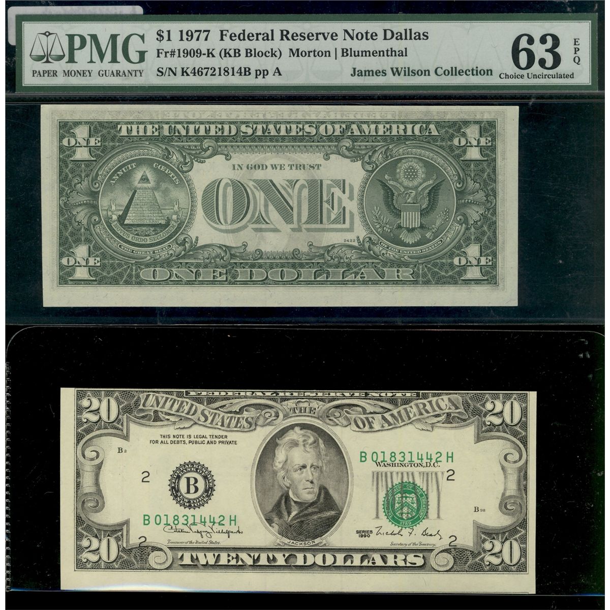 USA; 1977 $1 & 1990 $20 both with Minor Offset Printing Error. 1977 $1 graded PMG CH UNC63. $20 grades UNC.