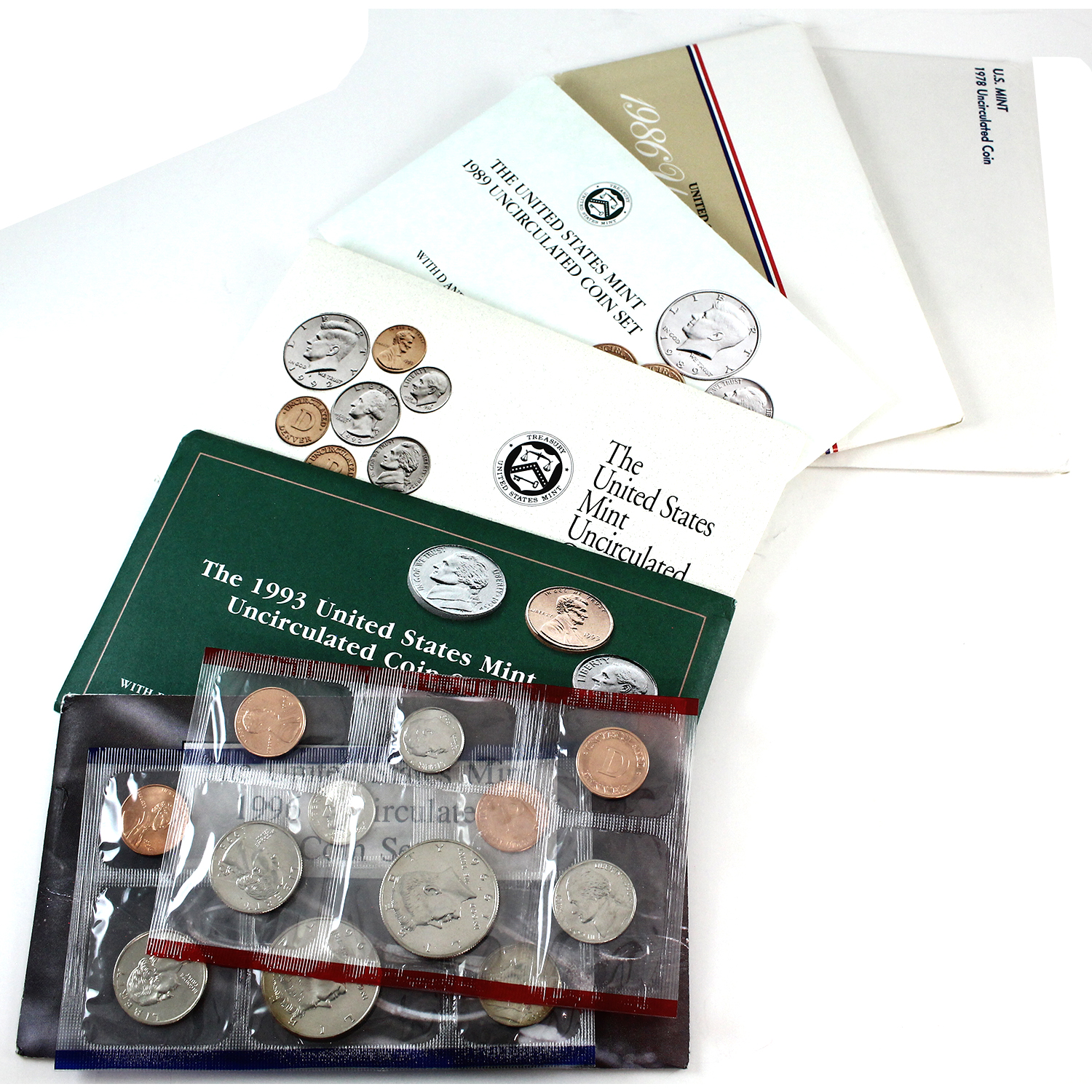 INCLUDES: 1978, 1986, 1989, 1992 (slight corrosion on red half), 1993, & 1996. Light to moderate toning on coins, slight wear on outer packaging. 6pcs.