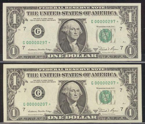 USA 1981 $1 notes. Lot of two low serial number replacement notes Gem UNC. #G00000207* and #G00000297*