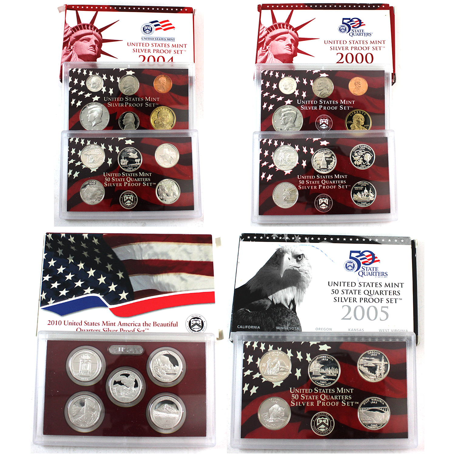 INCLUDES: 2000 & 2004 Silver Proof Sets, 2005 50 State Quarters & 2010 America the Beautiful Quarters. Wear/rips to the outer sleeves, minor wear to the plastic holders