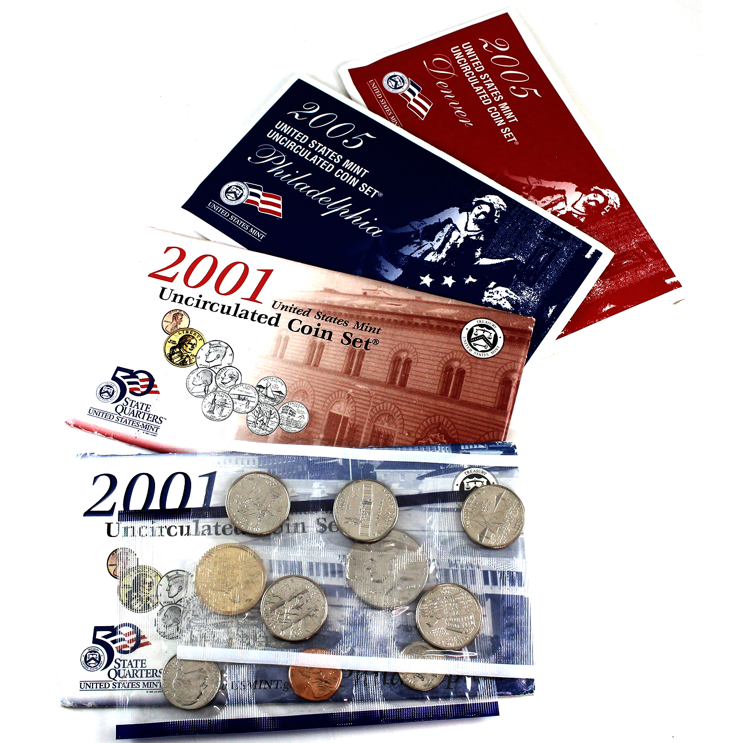 INCLUDES: 2001 Philadelphia 50 State Quarters, 2001 Denver 50 State Quarters, 2005 Philadelphia, & 2005 Denver. Set of 5 State Quarters included in each set. Light natural toning, light wear on packaging. 4pcs.