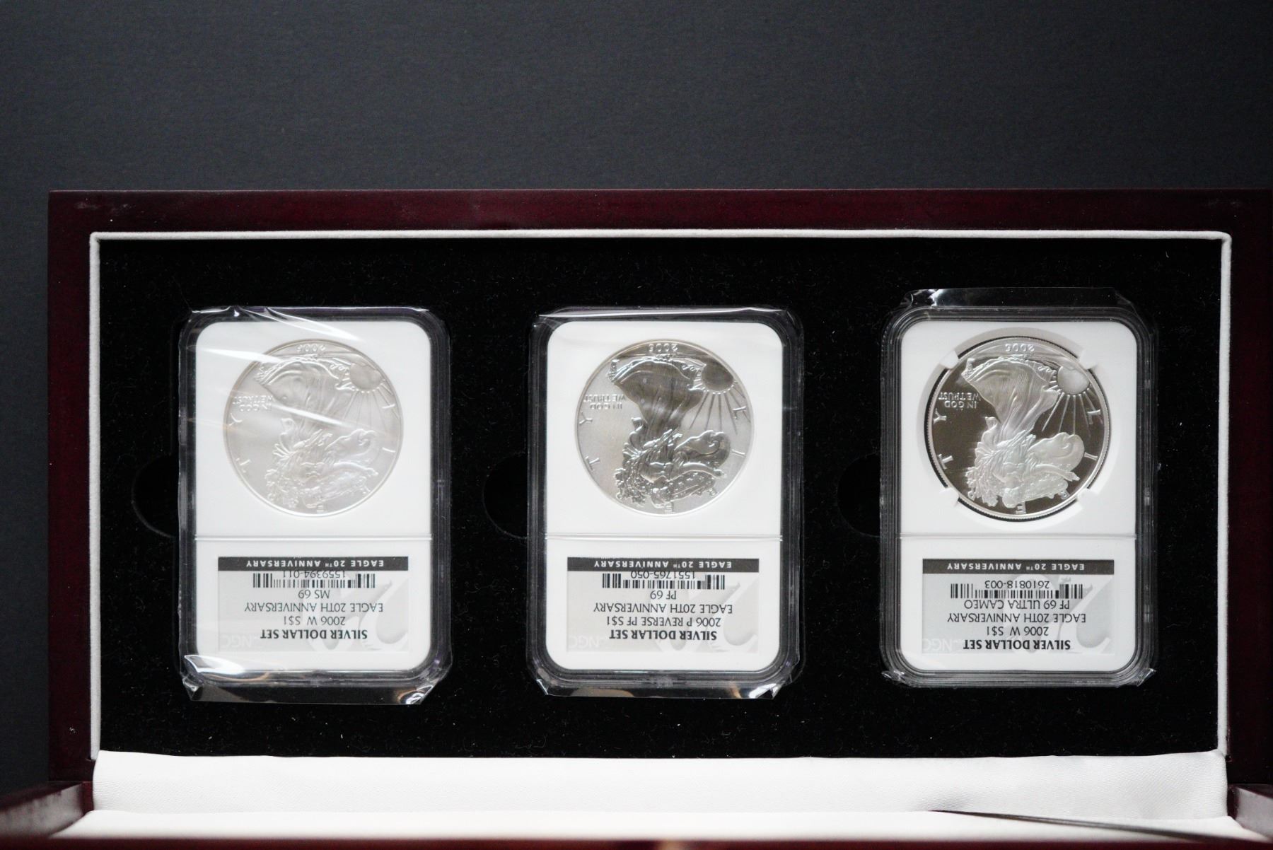 USA; 2006 $1 American Eagle 20th Anniversary Silver Coin Set, W PF69, P Reverse PF69 & 2006 W MS69. 3 Coin Set all NGC graded