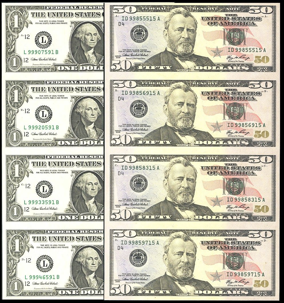 USA 2006 4 note sheets issued by the Bureau of Engraving and Printing. Entitled the New Colour of Money, this lot includes $1, $5, $10, $20 & $50 series. Also includes a separate 2003 $1 set of same type. All in there original covers.