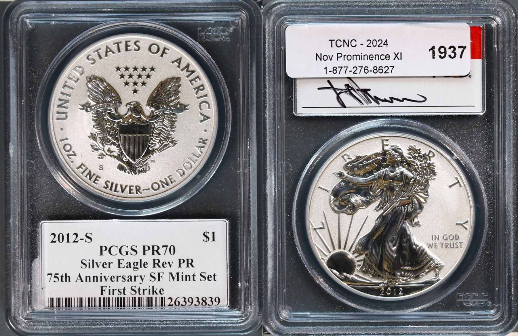 USA; 2012-S $1 Silver Eagle Rev PR 75th Anniversary SF Mint Set First Strike PCGS Perfect PROOF-70 with siganture John M. Mercanti