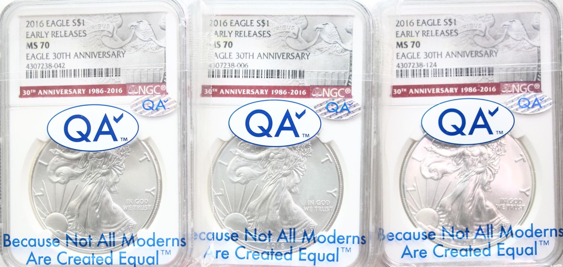 USA, 2016 $1 Silver Eagle Early Releases NGC MS70.  Lot of 3 coins.