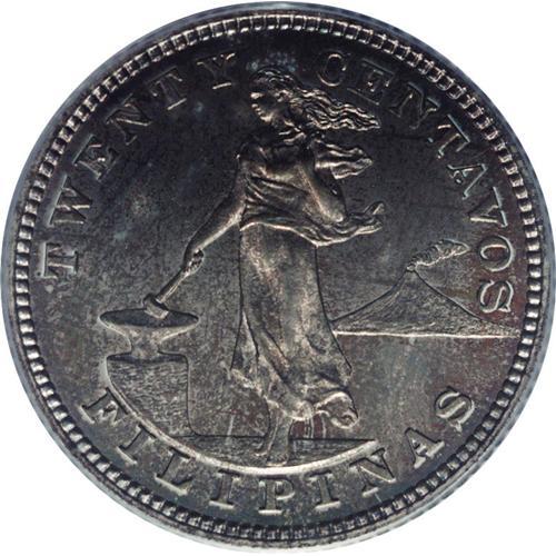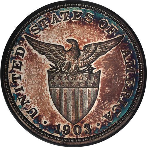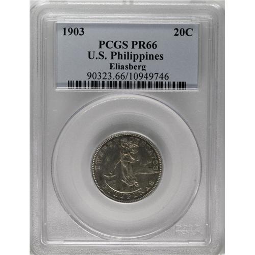 <B>USA Administration 20 Centavos Proof 1903,</B></I> KM-166, PR66 Eliasberg PCGS, shades of bright blue and ginger-ale gold iridescence, and essentially flawless. If you want a great one and miss this, where will you find another like it? Modestly priced at multiples of catalogue.<BR><I>From the Louis E. Eliasberg, Sr. Collection</B></I><BR><BR><b>Shipping:</b> Coin/Currency (<a target="_blank" href="http://www.heritageauctions.com/common/shipping.php">view shipping information</a>)