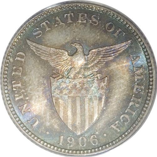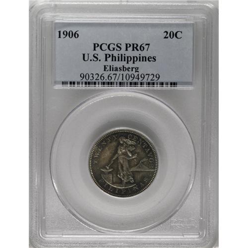 <B>USA Administration 20 Centavos Proof 1906,</B></I> KM-166, PR67 Eliasberg PCGS, awesome quality with shades of deep grayish green, vivid neon-blue, and amber-gold iridescence. Nonpareil.<BR><I>From the Louis E. Eliasberg, Sr. Collection</B></I><BR><BR><b>Shipping:</b> Coin/Currency (<a target="_blank" href="http://www.heritageauctions.com/common/shipping.php">view shipping information</a>)