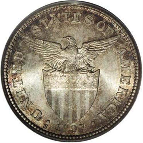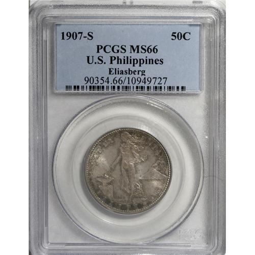 <B>USA Administration 50 Centavos 1907-S,</B></I> KM-171, MS66 Eliasberg PCGS, a super-gem coin with fantastic surfaces, and lovely delicate golden blue iridescence. The mintmark is so clear and sharp that it nearly leaps off the metal at you! We believe our top estimate will be exceeded by bidders.<BR><I>From the Louis E. Eliasberg, Sr. Collection</B></I><BR><BR><b>Shipping:</b> Coin/Currency (<a target="_blank" href="http://www.heritageauctions.com/common/shipping.php">view shipping information</a>)