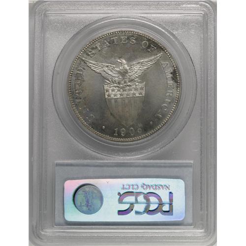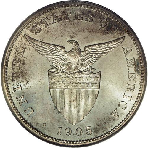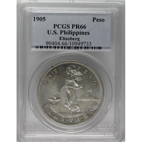 <B>USA Administration Peso Proof 1905,</B></I> KM-168, PR66 Eliasberg PCGS, virtually perfect, the surfaces a uniform silvery color with light golden hues, fantastic strike and ungodly eye-appeal. This specimen could set a price record for this date. Proof mintage was a mere 471 coins.<BR><I>From the Louis E. Eliasberg, Sr. Collection</B></I><BR><BR><b>Shipping:</b> Coin/Currency (<a target="_blank" href="http://www.heritageauctions.com/common/shipping.php">view shipping information</a>)