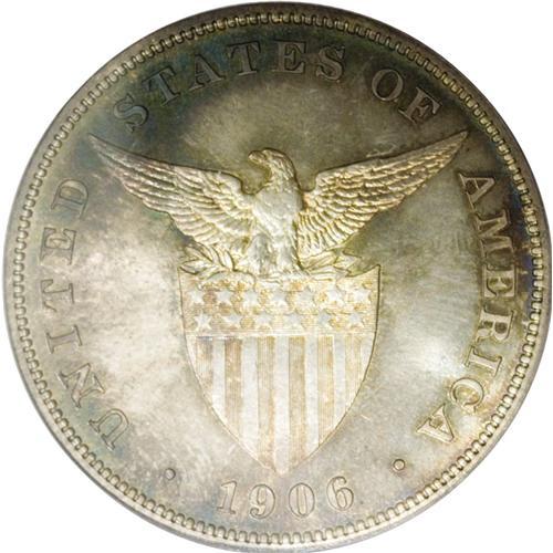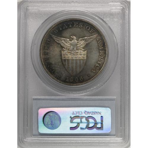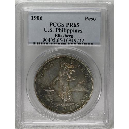 <B>USA Administration Peso Proof 1906,</B></I> KM-168, PR65 Eliasberg PCGS, glorious and bright gold and blue iridescent toning with the mirrors beneath gleaming and highly reflective. Nobody will care about the single tiny contact mark on Liberty's thigh. This is a superb coin with fabulous eye-appeal and it could set a record in this auction. Only 500 were minted.<BR><I>From the Louis E. Eliasberg, Sr. Collection</B></I><BR><BR><b>Shipping:</b> Coin/Currency (<a target="_blank" href="http://www.heritageauctions.com/common/shipping.php">view shipping information</a>)