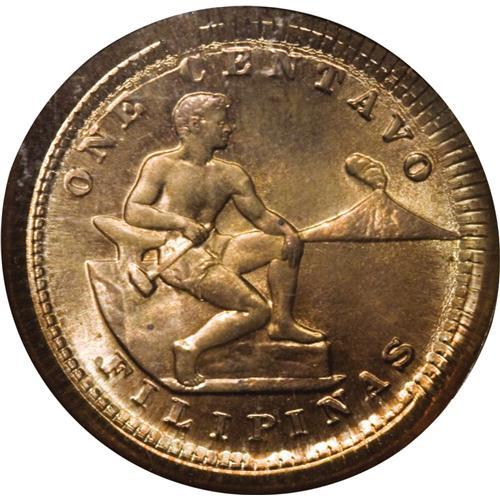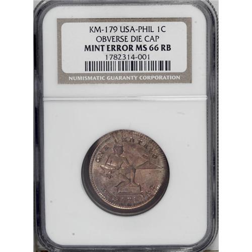 <B>USA Administration error 1 Centavo (ND shows),</B></I> KM-179, MS66 RB NGC "Obverse Die Cap." Intense red mint luster on the capped side, the other side mostly brown and showing a dramatic ghost image of the obverse. Very rare and desirable to many specialized collectors of both USA and Philippines coins.<BR><BR><b>Shipping:</b> Coin/Currency (<a target="_blank" href="http://www.heritageauctions.com/common/shipping.php">view shipping information</a>)