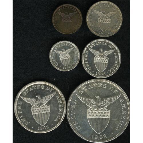 <B>USA Administration partial Proof set 1903,</B></I> KM-PS1, consisting of the following: Half Centavo, a very Choice if not gem Proof with gorgeous purple-red surfaces; 5 Centavos, Choice Proof, lightly toned; 10 Centavos, Choice brilliant Proof; 20 Centavos, brilliant Proof, light hairlines; 50 Centavos, brilliant Proof, light hairlines and a few contact abrasions; and Peso, brilliant Proof and nearly choice, quite a sharp-looking and attractive coin. A desirable lot.<BR><BR><b>Shipping:</b> Coin/Currency (<a target="_blank" href="http://www.heritageauctions.com/common/shipping.php">view shipping information</a>)