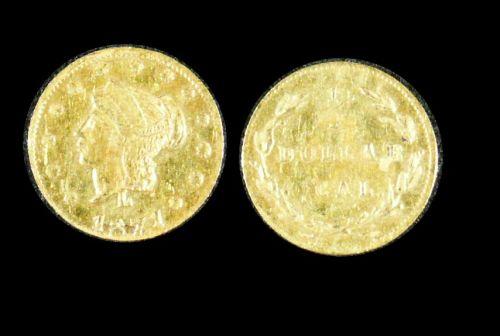 USA. California Gold Quarter dollar of 1871. Round with small Liberty head, and an L and the date below bust. KM-5.8 variety (L instead of G below the bust). Grade : AU-55.