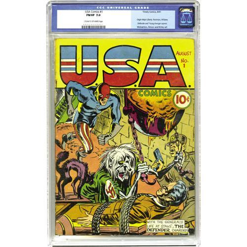 <B>USA Comics #1 (Timely, 1941) CGC FN/VF 7.0 Cream to off-white pages.</B></I> Early Timely covers always have a certain pizzazz to them, but few have the impact of this historic issue. Starting with a wild World War II cover by Joe Simon and Jack Kirby featuring the Defender, this issue contains the origin of Mr. (later Major) Liberty, with art by Syd Shores. There's also Rockman by Basil Wolverton (with a splash panel by Simon and Kirby); Jack Frost by Carmine Infantino, from a Stan Lee script; and the Whizzer, with art by Al Avison. Overstreet 2006 FN 6.0 value = $3,501; VF 8.0 value = $8,753. CGC census 3/06: 3 in 7.0, 6 higher.