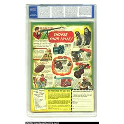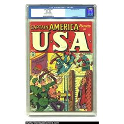 USA Comics #11 (Timely, 1944) CGC VF+ 8.5 Off-white to white pages. Our World War II foes should know better than to try that bondage/torture stuff on the cover of a comic book that stars Captain America. They've even riled Bucky! Syd Shores does the cover honors here. This issue may be more scarce than previously thought; this is the only unrestored copy to be certified by CGC to date. CGC notes, "One-inch tear on 23rd page." Overstreet 2003 VF 8.0 value = $950; VF/NM 9.0 value = $1,350. Important notice: Heritage usually auctions material at the rate of 200-250 lots per hour. On some occasions eBay Live bid software or the Internet may not be able to keep up with the pace of the auction. We recommend placing a realistic absentee bid now as insurance to avoid disappointment. Occasionally the auctioneer may eliminate or reject an eBay Live bid, and the auctioneer may also reopen a lot after the close of the eBay live bidding (usually because we missed an audience bid), and may reject your bid even if it shows you as the winning bidder. By bidding via eBay Live, you agree that Heritage may award the lot to another bidder at its sole discretion under the circumstances described above or any other reasonable circumstances. Also please note that all Heritage lots purchased through eBay Live carry a 20% Buyer's Premium. Please make sure you read the Terms and Conditions before you bid.