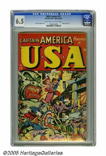 <B>USA Comics #12 (Timely, 1944) CGC FN+ 6.5 Light tan to off-white pages.</B></I> It's all-out Alex Schomburg action on the cover, with a couple of unusual twists as Captain America uses a Tommy gun and Bucky gets the girl, or at least gets to <I>save</B></I> the girl. The Destroyer and the Whizzer are among the good guys inside, and Hitler is among the <I>bad</B></I> guys inside. Overstreet 2005 FN 6.0 value = $486; VF 8.0 value = $1,013. CGC census 5/05: 1 in 6.5, 2 higher.