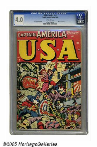 <B>USA Comics #12 (Timely, 1944) CGC VG 4.0 Off-white pages.</B></I> Alex Schomburg cover. Hitler appearance. Overstreet 2005 VG 4.0 value = $324. CGC census 5/05: 1 in 4.0, 3 higher.