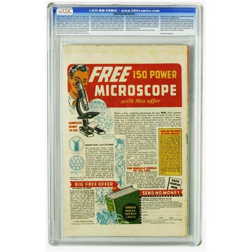 <B>USA Comics #17 (Timely, 1945) CGC VF/NM 9.0 White pages.</B></I> The final issue of this title, this one's got a bondage cover by Alex Schomburg -- when your face is on the baddies' "Wheel of Death," you've got to spring into action as Cap does here! The Whizzer and the Destroyer round out the issue's lineup. Overstreet 2005 VF/NM 9.0 value = $1,147; NM- 9.2 value = $1,550. CGC census 11/05: 2 in 9.0, 1 higher.