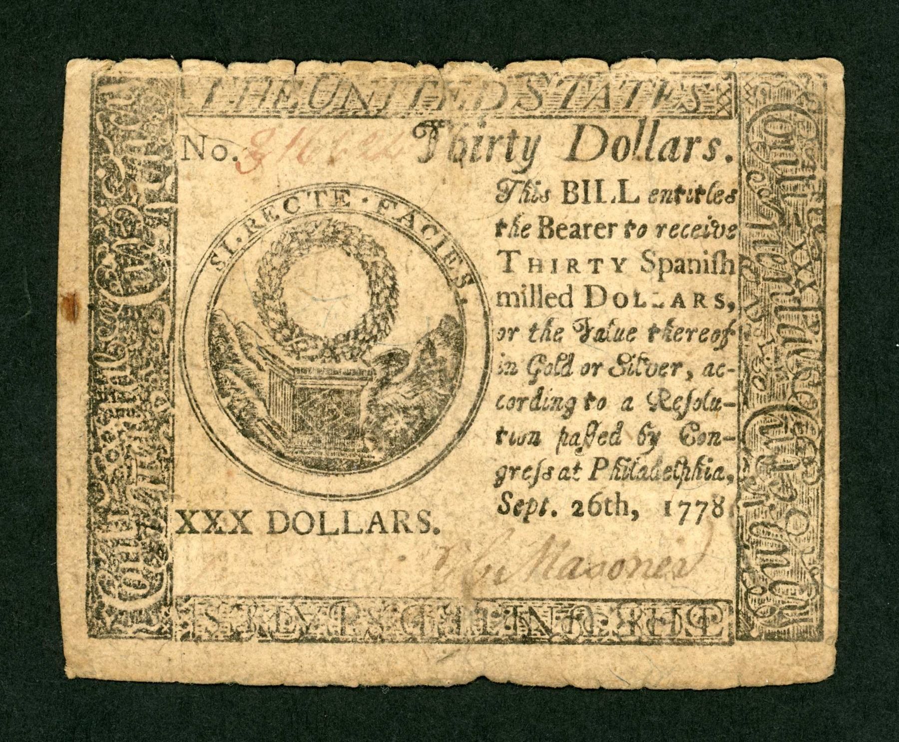 USA. Continental Congress $30.00 1778 Banknote Very Fine