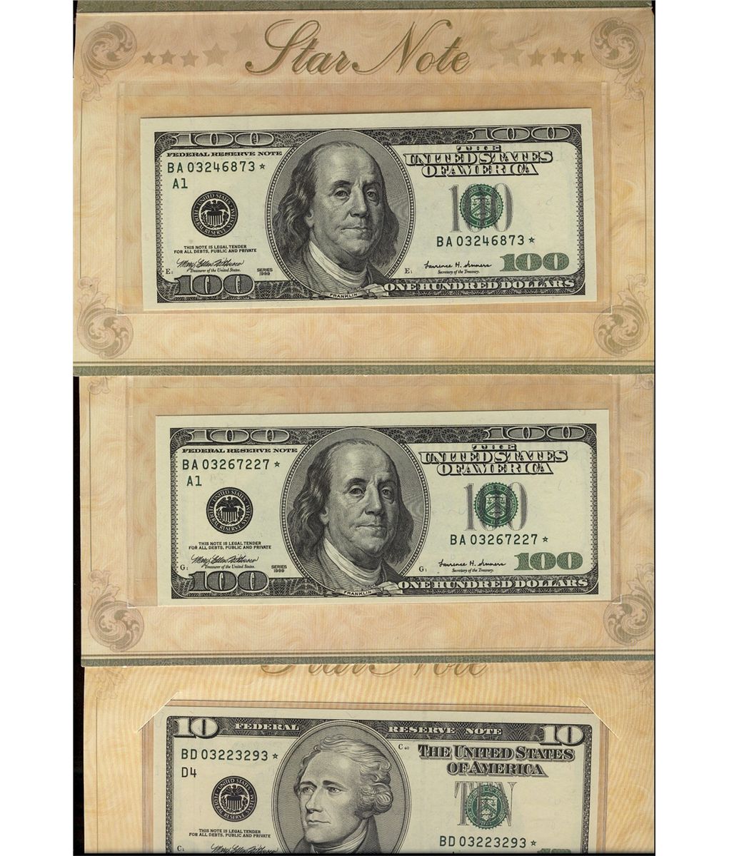 USA Currency Star note Commemerative issues. Includes 1999 $5, $10 & $100(2). Lot of 4 examples all in original beige covers.