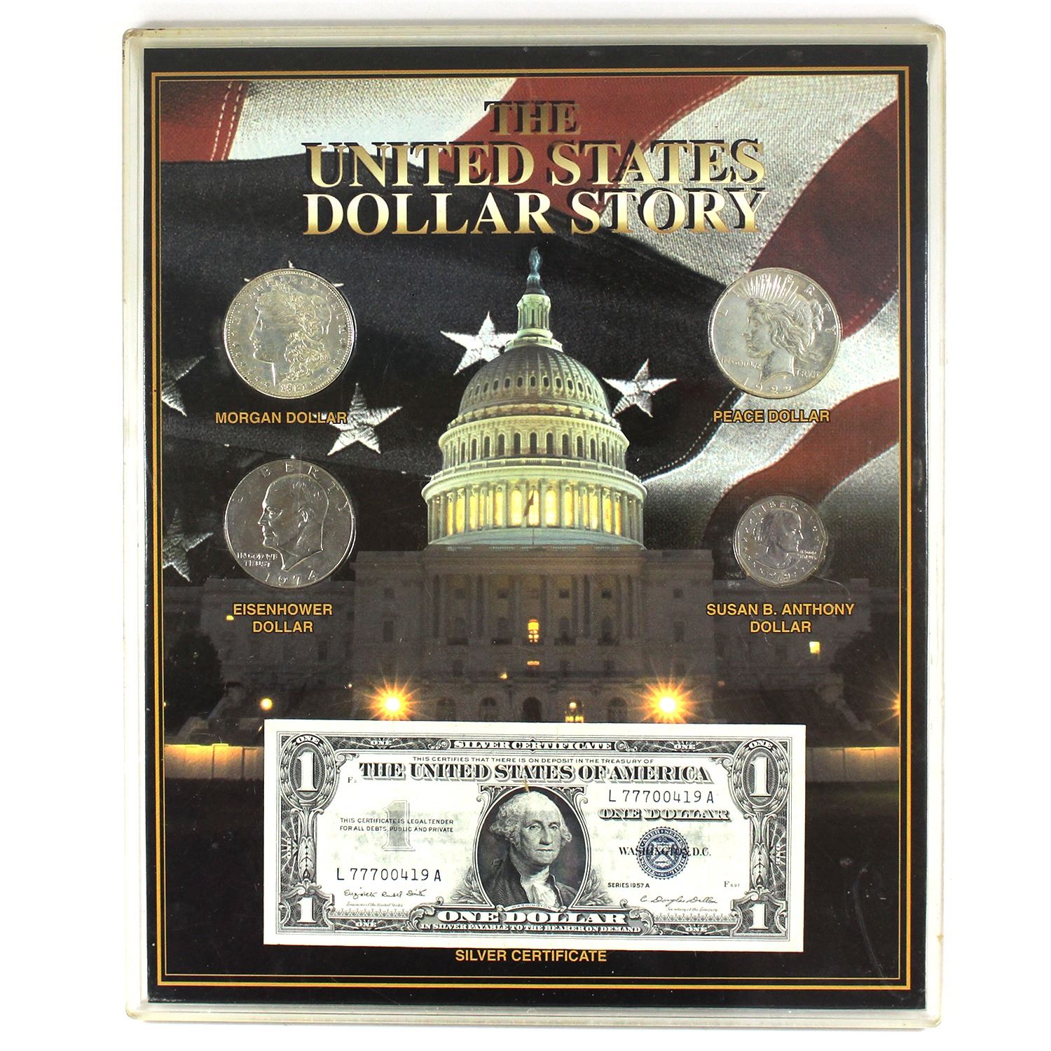 *USA Dollar Story 4-coin Set with $1 Silver Certificate in Acrylic Display Frame. Includes: Morgan, Peace, Eisenhower, Susan B. Anthony, & 1957 $1 Silver Certificate Note. Information about each piece on back of holder. Scuffed acrylic.