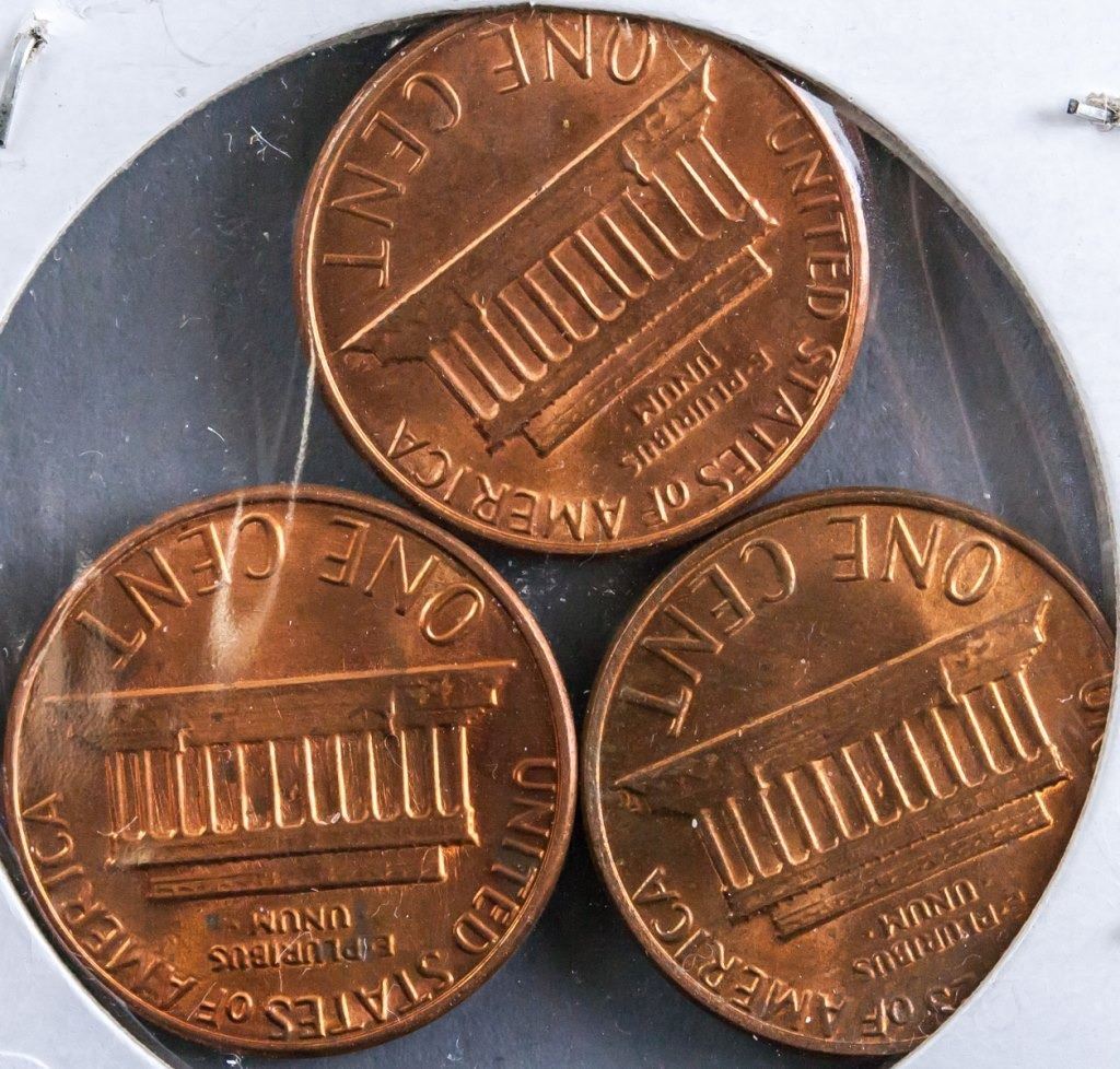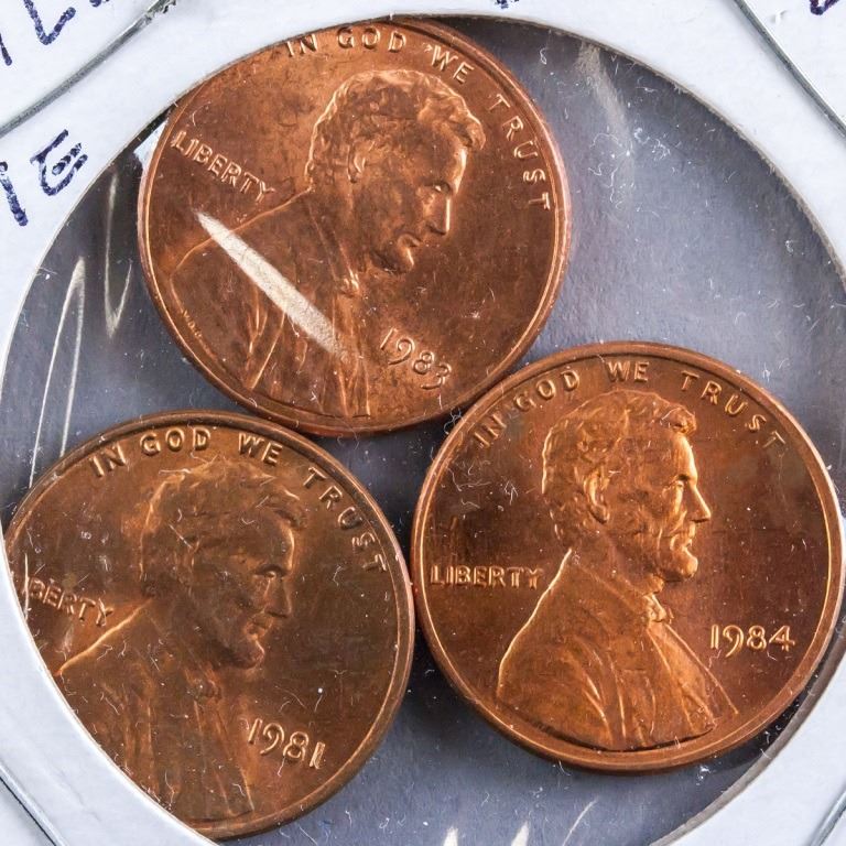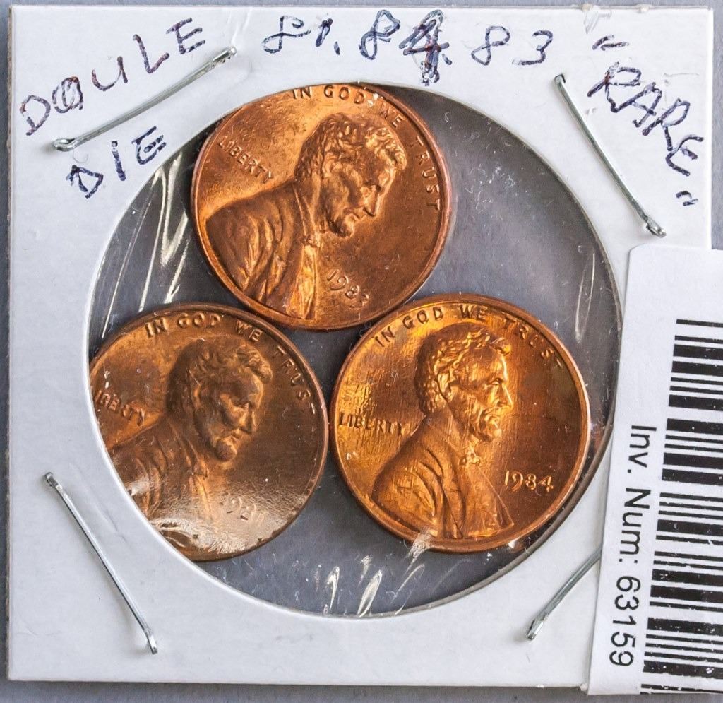 Lot of 3 USA Lincoln pennies. Double-die copper coins. From 1981, 1983, and 1984. 10 grams (including case).