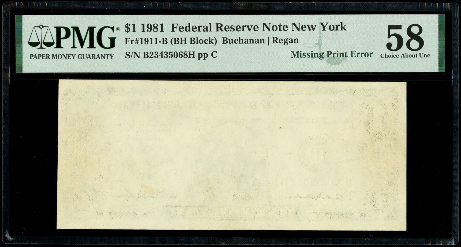 USA, FRB of New York, $1 Federal Reserve Note, series 1981, serial B23435068H, with missing back printing error, PMG Choice AU 58. Fr-1911-B. Completely missing back printing on this "uniface" dollar bill. Please use this link to verify the certification number