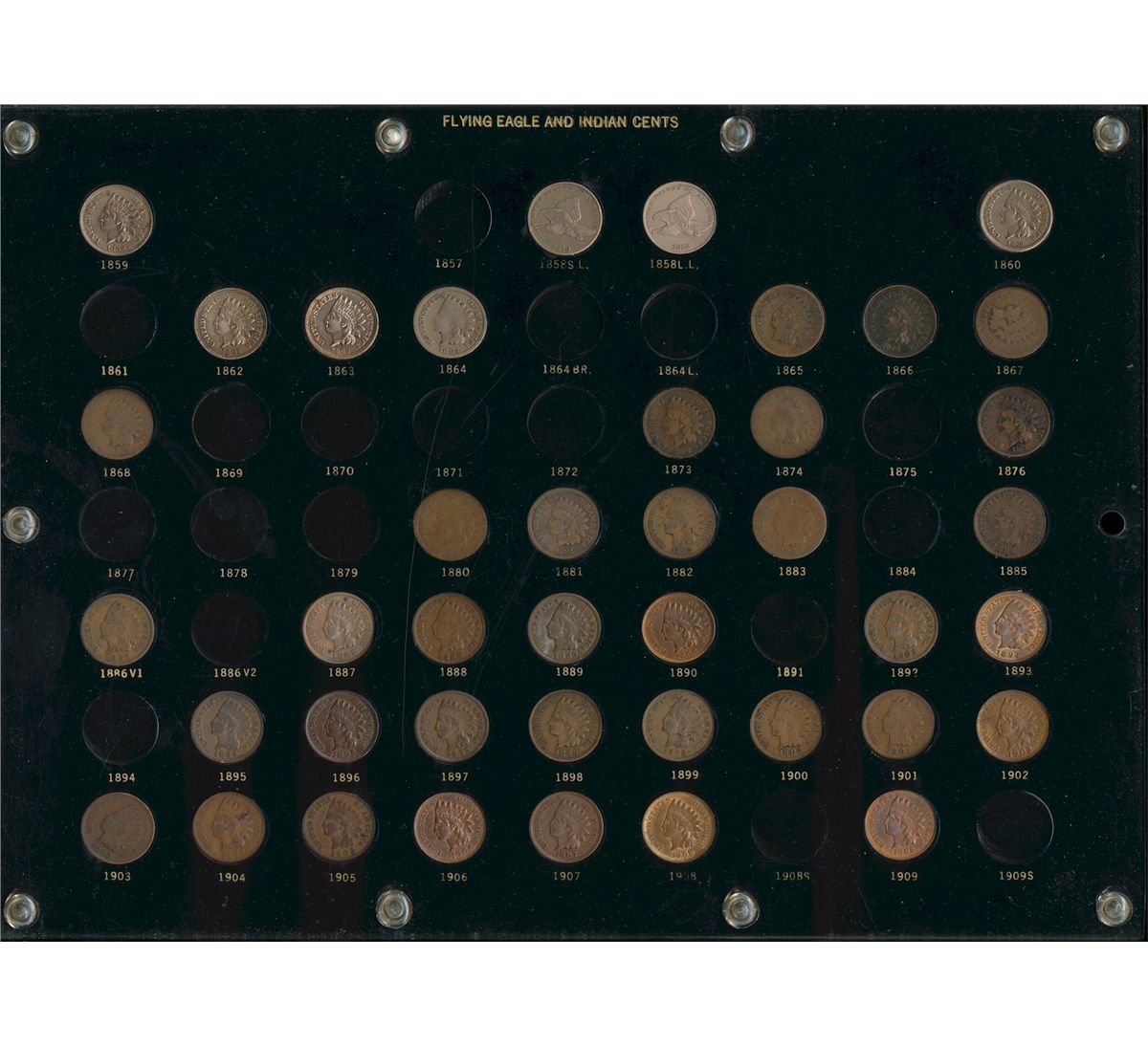 USA; Flying Eagle & Indian Cents incomplete date set. 1858-1909S. Lot of 40 pcs Fair to AU. Includes better issues 1858 SL, 1858 LL, 1859, 1860, 1866, 1867 & 1868. A nice starter set.