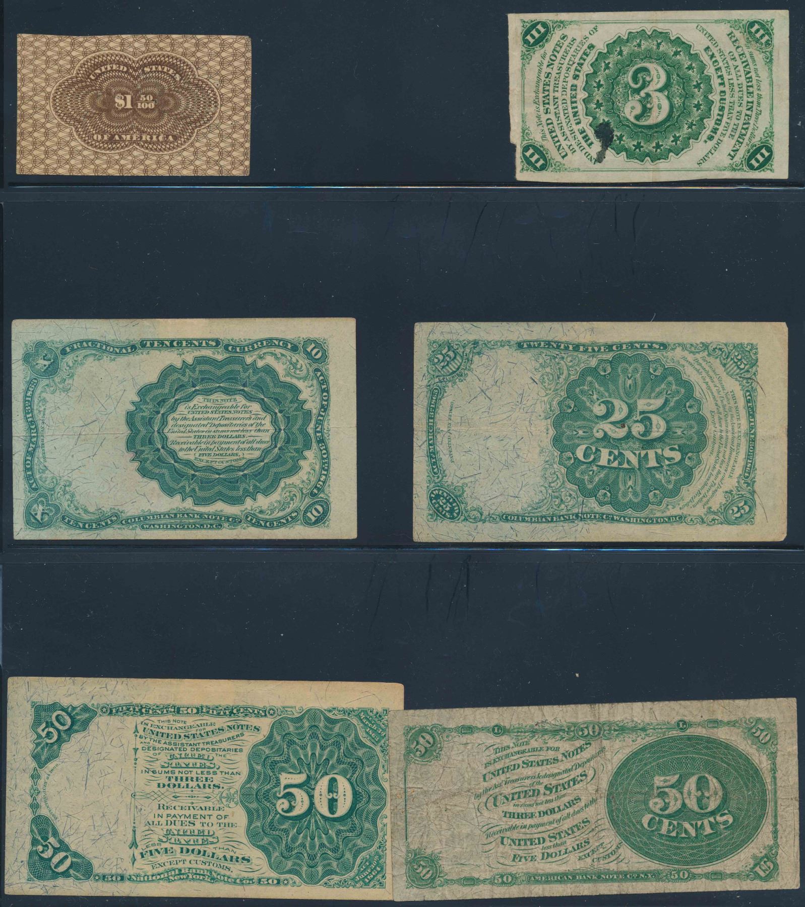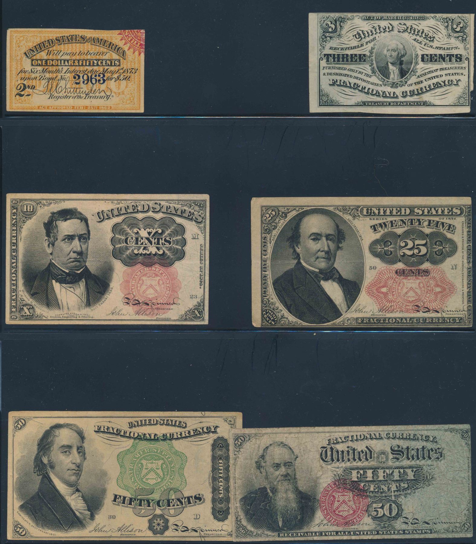 USA Fractional Currency Lot of Six Different Notes, plus one Coupon
