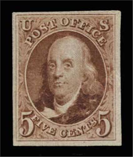 1875 re-issue of the 1847 5c red-brown (SG 3), produced for the 1876 Centennial Exposition, four small to large margins, fresh unused, very scarce.