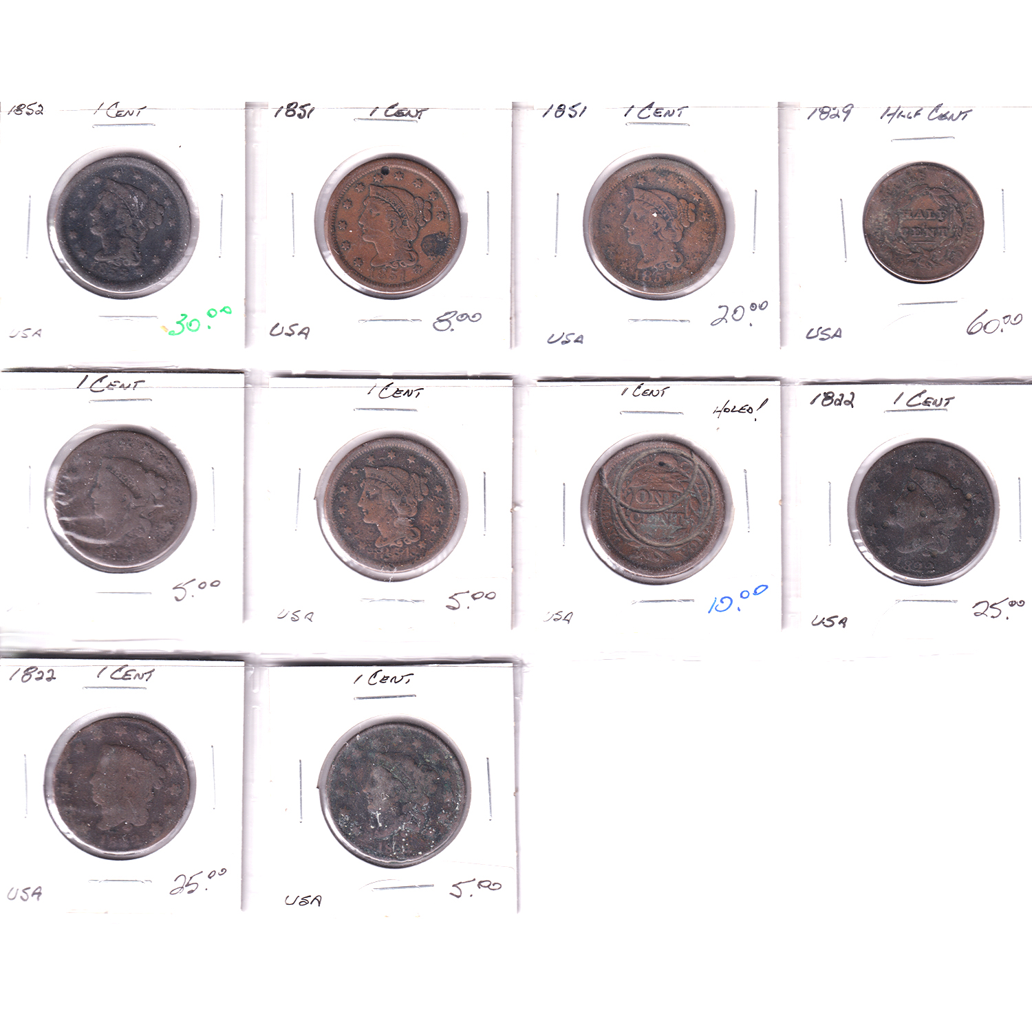 INCLUDES: Half Cent 1829, 1-cent 1822, 1-cent 1851 & More!! Sold as is; please see images for details. 10pcs.