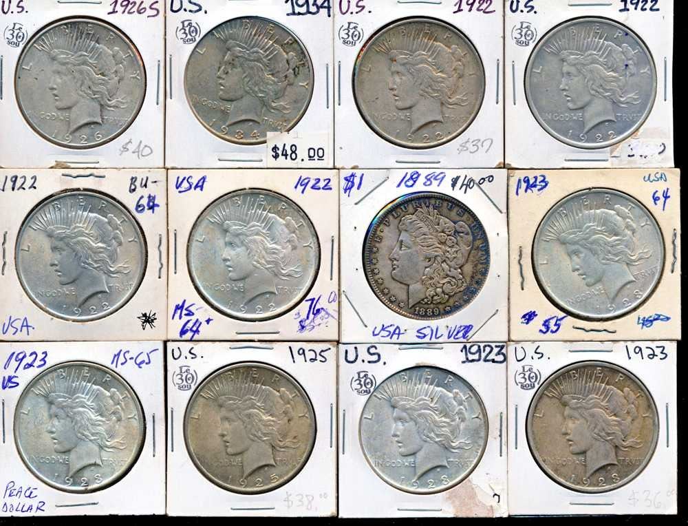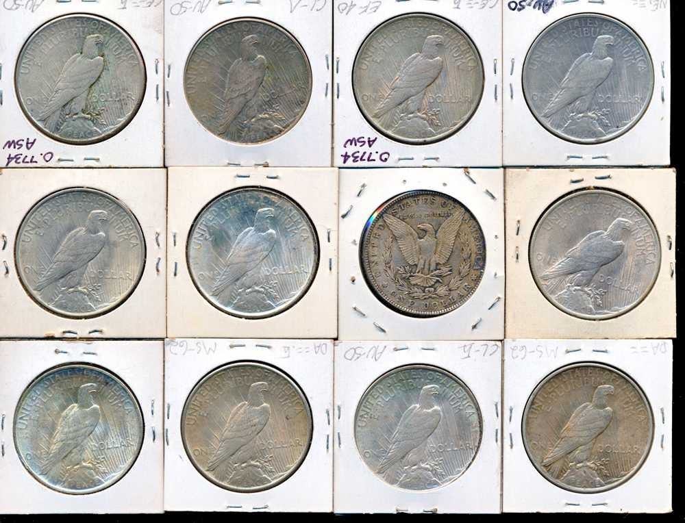 Lot of twelve $1 coins: 1889 EF, 4 x 1922 VF-UNC, 4 x 1923 VF-UNC, 1925 VF, 1926-S VF, 1934 EF. ASW 9.2814 oz.