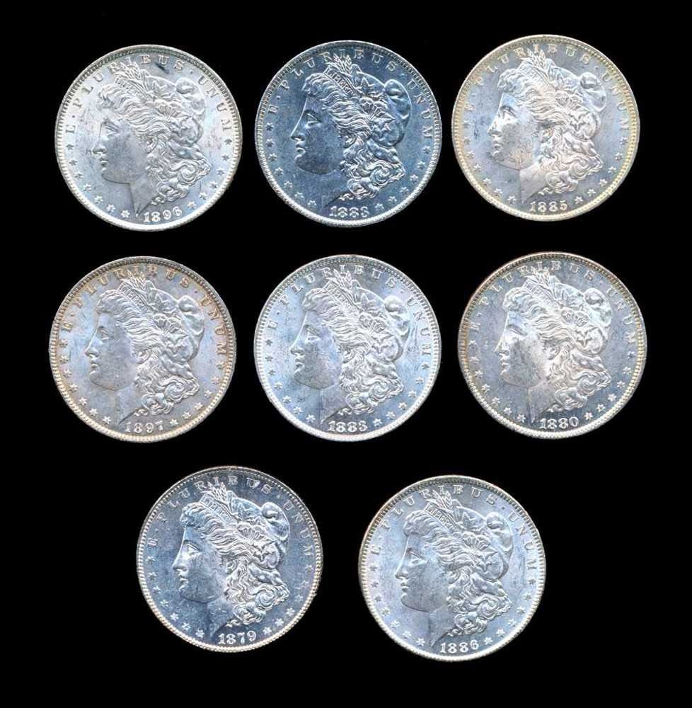 Lot of eight uncirculated, uncertified coins: $1 1896-P unc, $1 1883-O unc, $1 1883-P unc, $1 1883-O unc, $1 1897-P unc, $1 1886-P unc, 1879-P unc, 1880-P unc. ASW 6.1875 oz.