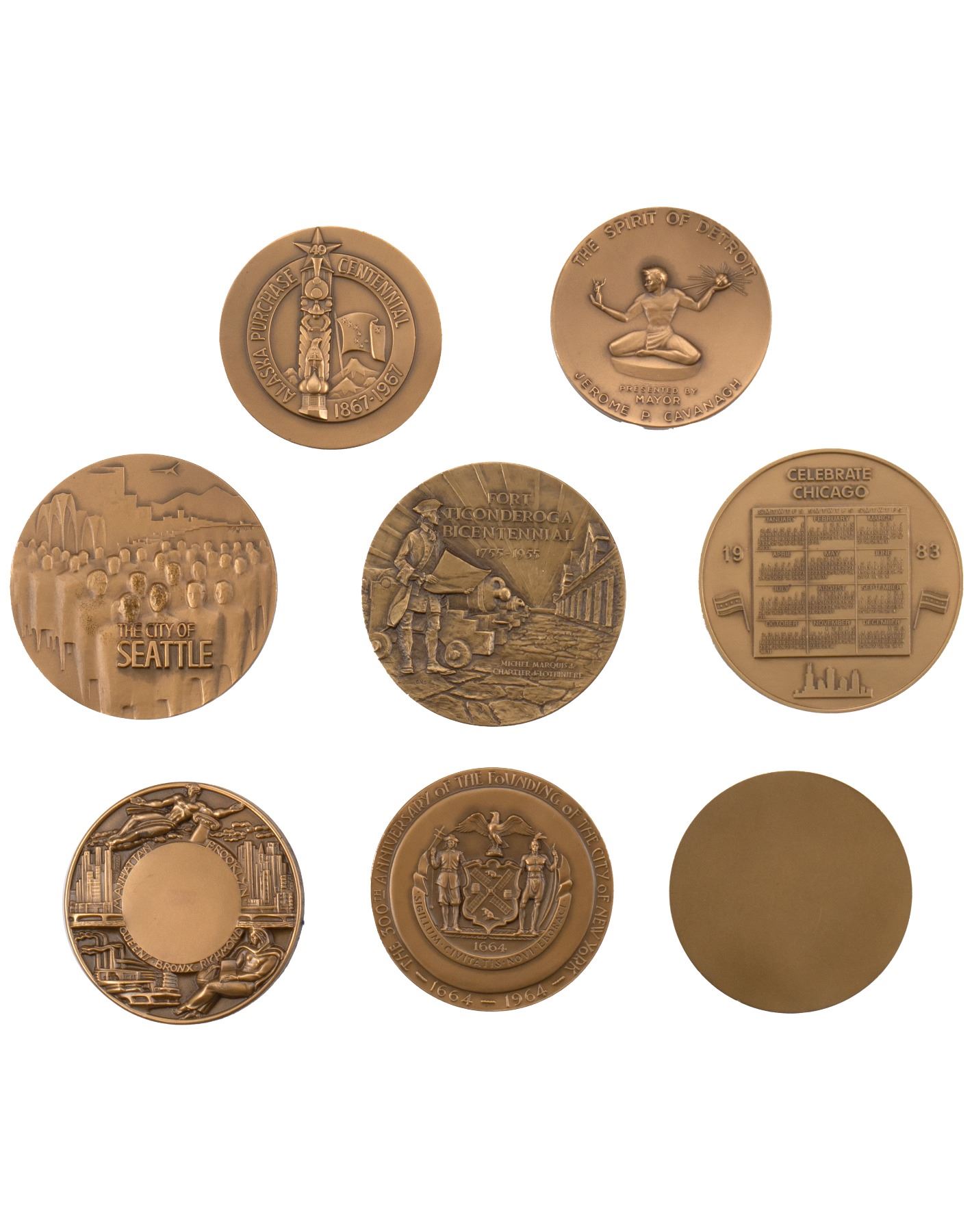Toutes sont marquEes Medallic art co. sur la tranche, inclut: Alaska purchase Centennial, Fort Ticonderoga bi Centennial, Chicago sesquicentennial, City of Seattle honoring aero-space pioneers, City of Dayton, Ohio, City of Detroit, City of New York, New York world fair.