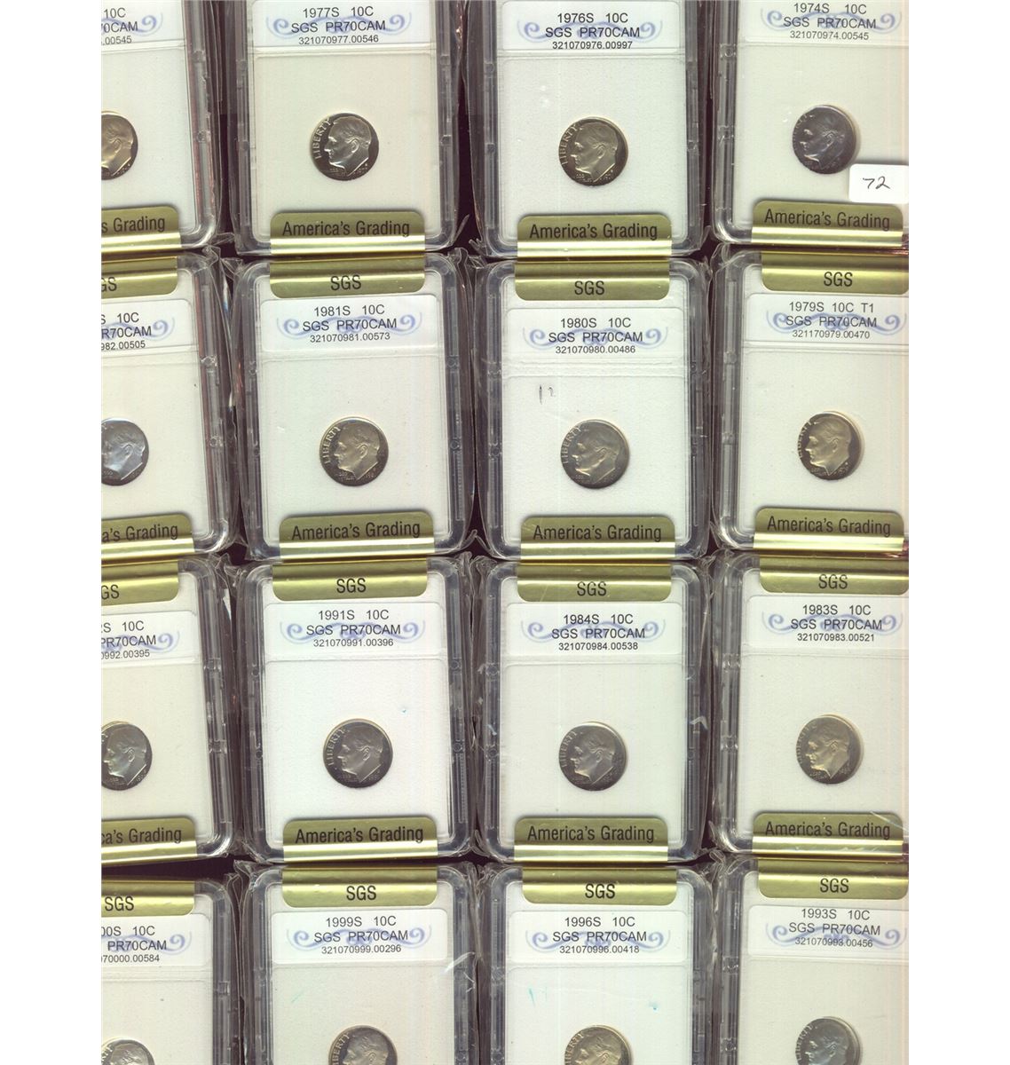 USA Lot; includes 1974S 10¢ to 2006S Partial date Set. Lot of 25 pcs all different dates all SGS graded PR70Cam.