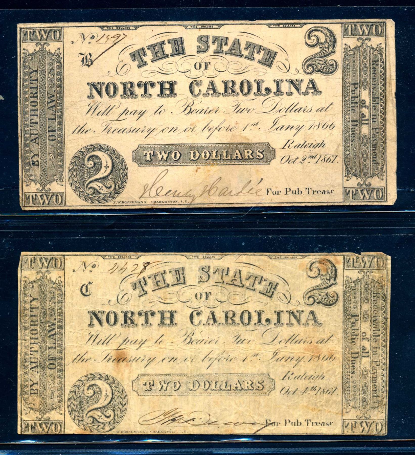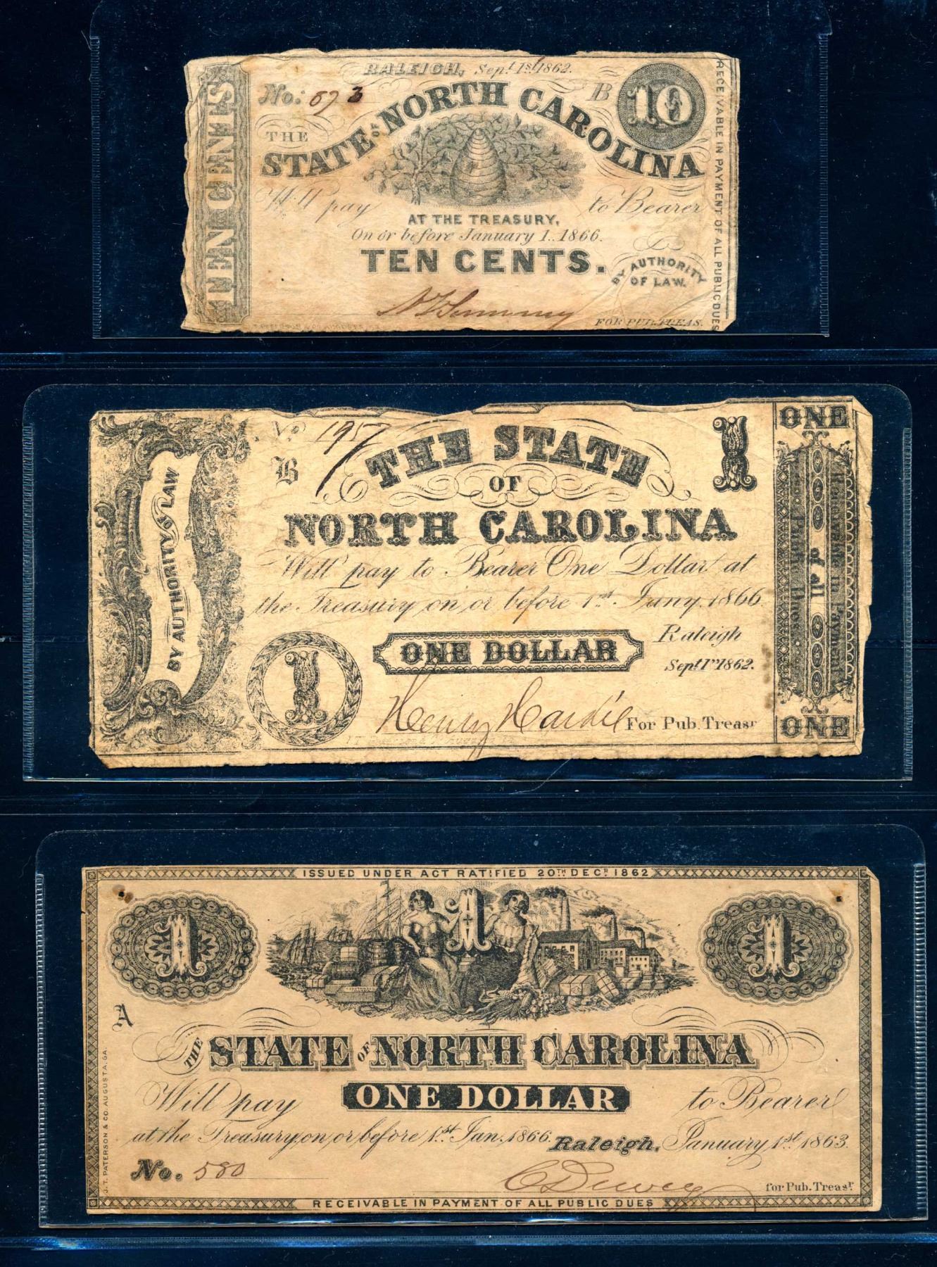 Included : 10 cents North Carolina 1866, $1 North Carolina 1862, $1 North Carolina 1863, 2 x $2 North Carolina 1861