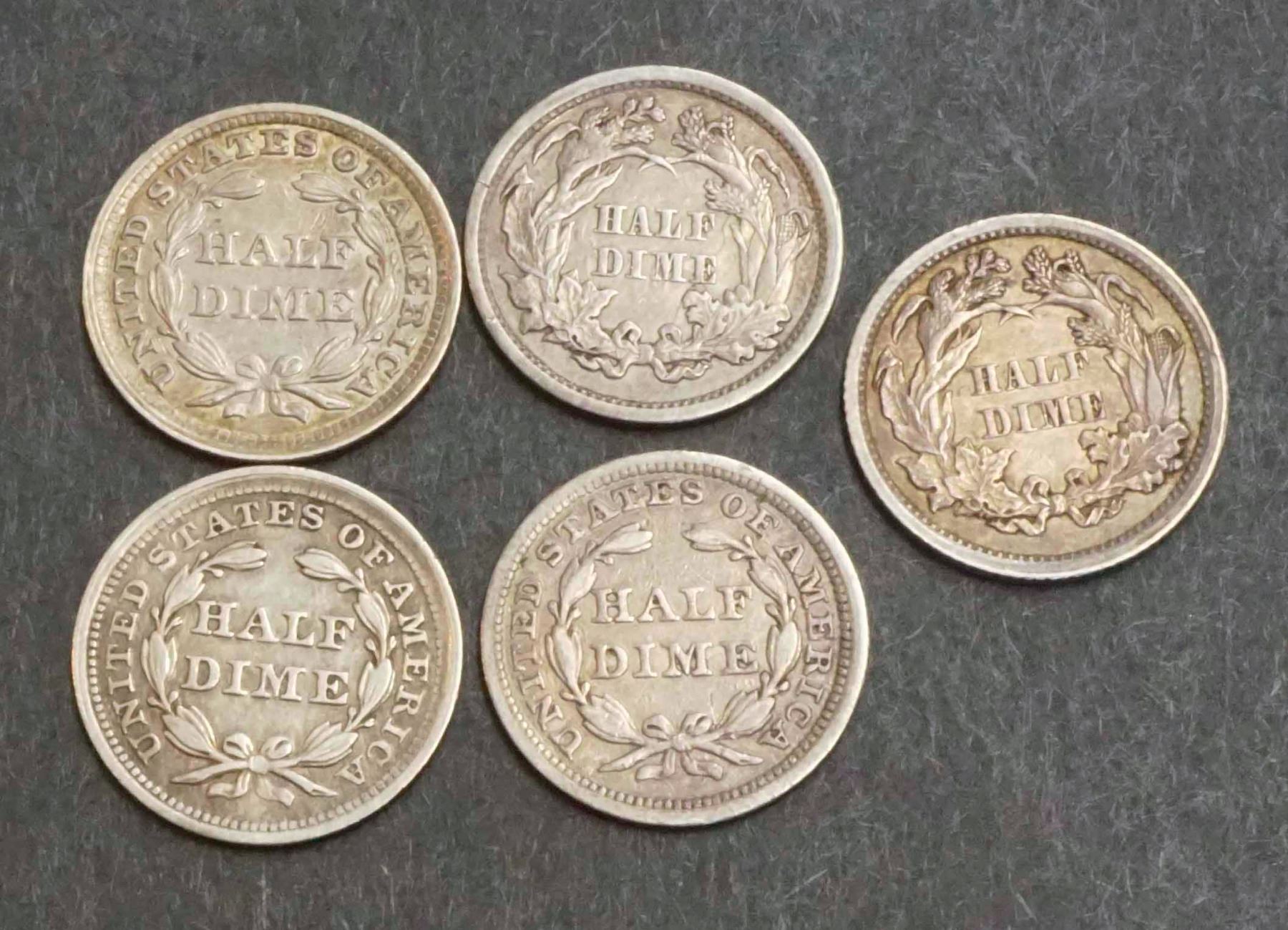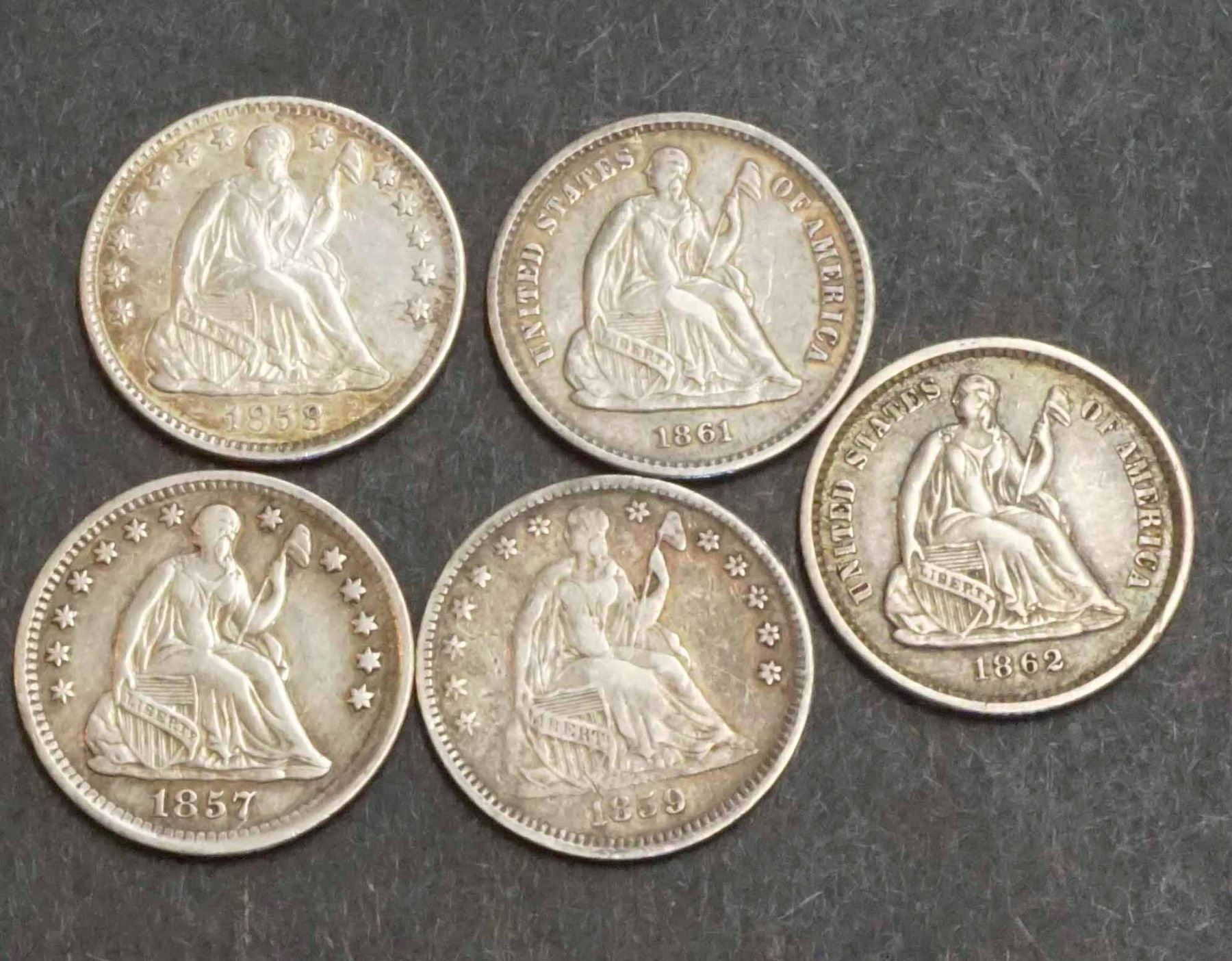 1) 1857 VF+. ; 2) 1858 EF. ; 3) 1859 EF. ; 4) 1861 EF. ; 5) 1862 AU,, Not certified. Graded to the best of our knowledge. Catalogue value circa USD 385.