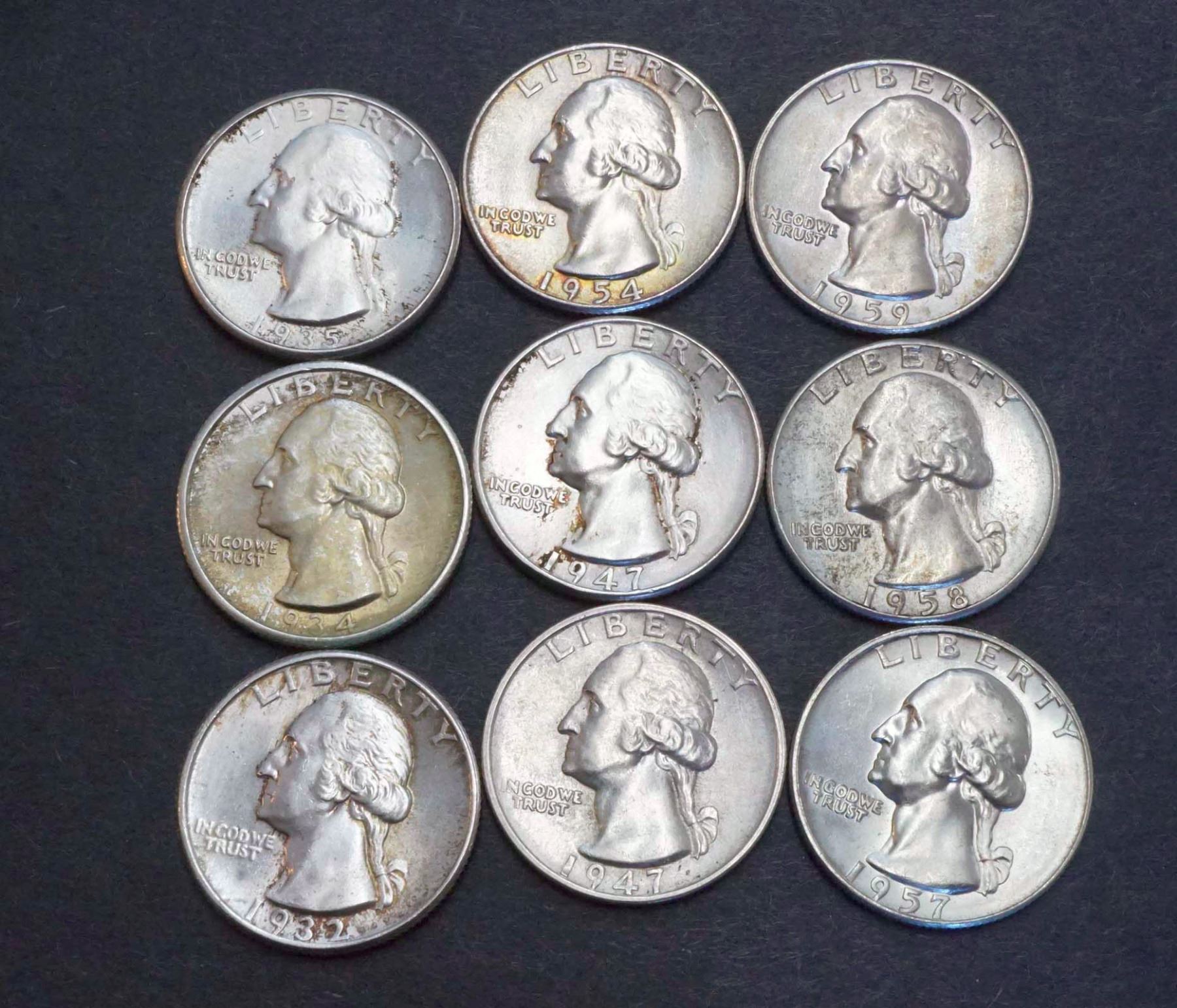 1) 1932 - MS63, 2) 1934 lg. Motto - MS60, 3) 1934 - MS64, 4) 1947s - MS63, 5) 1947 - MS64, 6) 1954 - 1954 - MS64, 7) 1957D - MS65, 8) 1958 - MS64, 9) 1959D - MS64. Uncertified. Graded to the best of our knowledge. Catalogues value : USD : 275. 60 / 75 / 100
