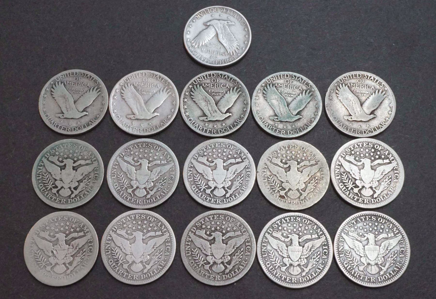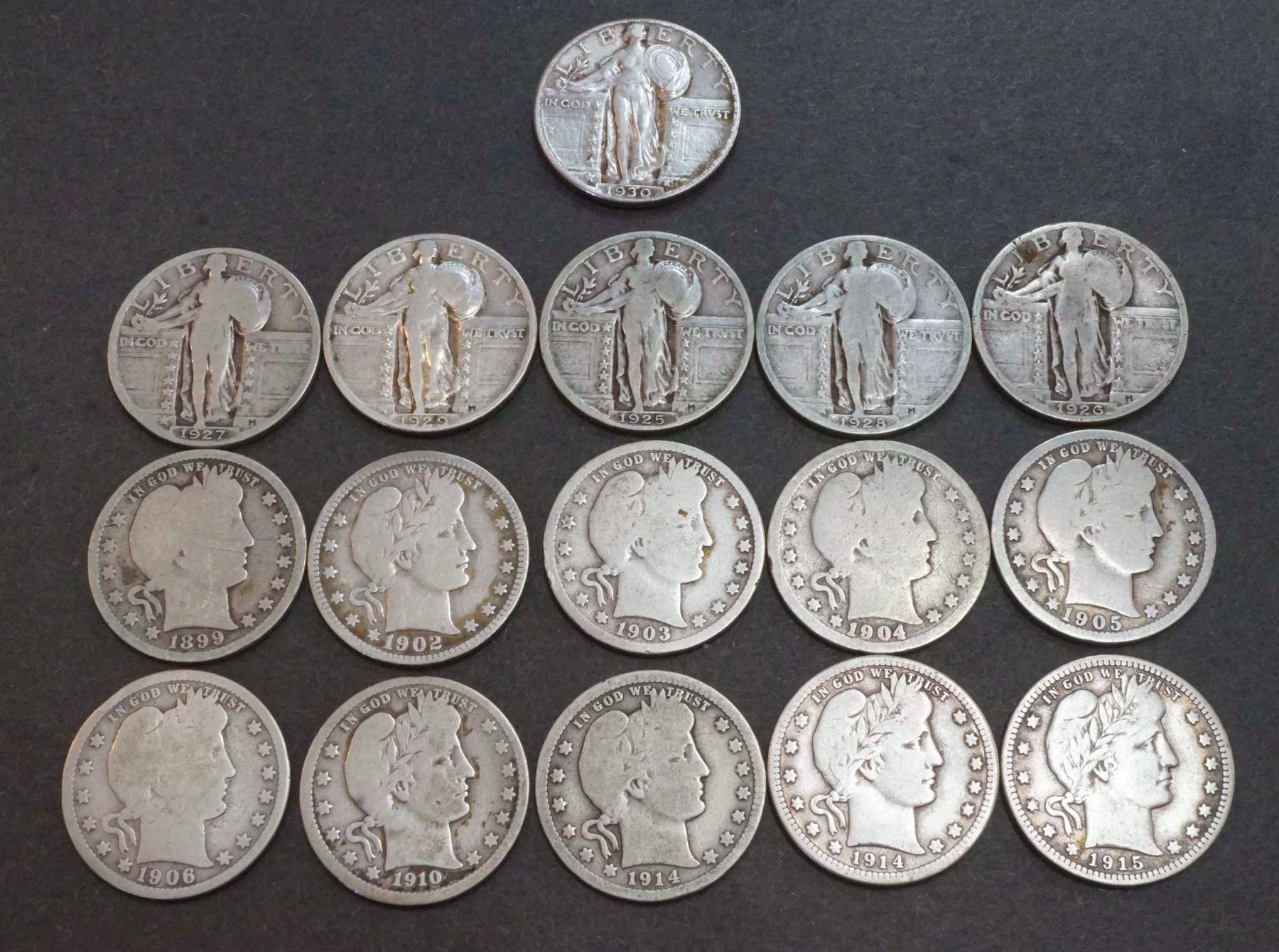 Mostly well worn, especially the Barbers. 1899-1902-03-04-05-06-10-14-14D-15. The Standing Liberties are 1925-6-7-8-9-30. These are nicer, with the 1929 in VF and the 1930 in AU. 50 / 60 / 75