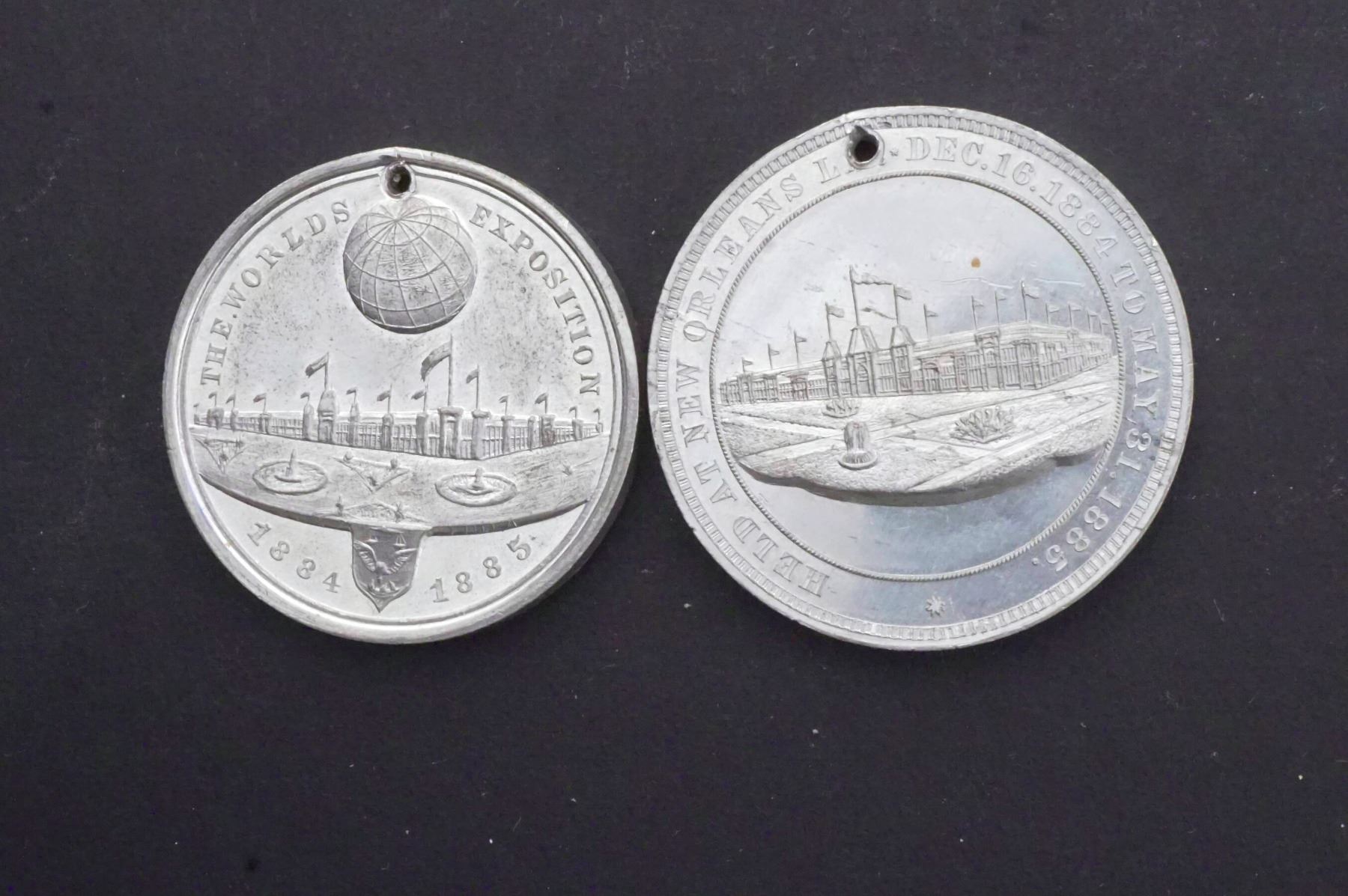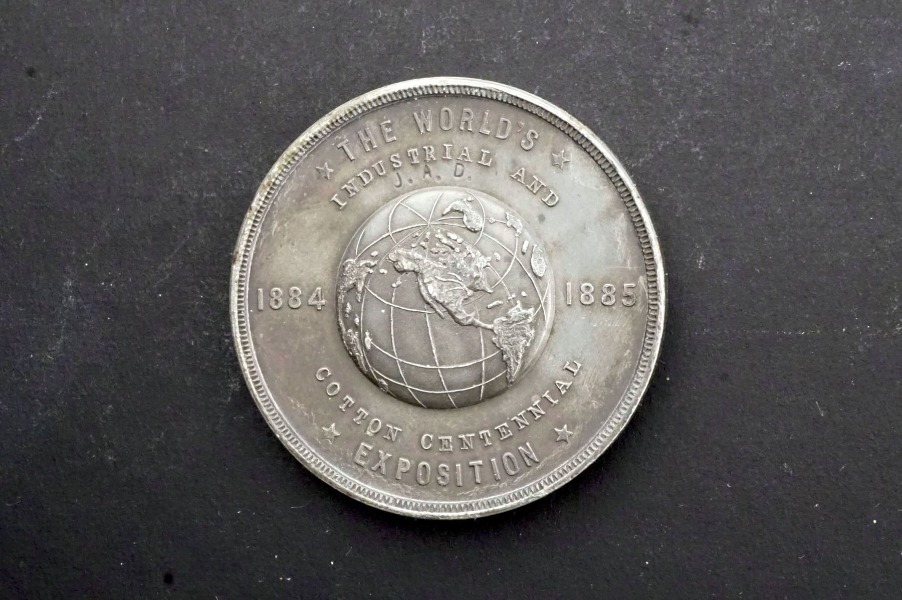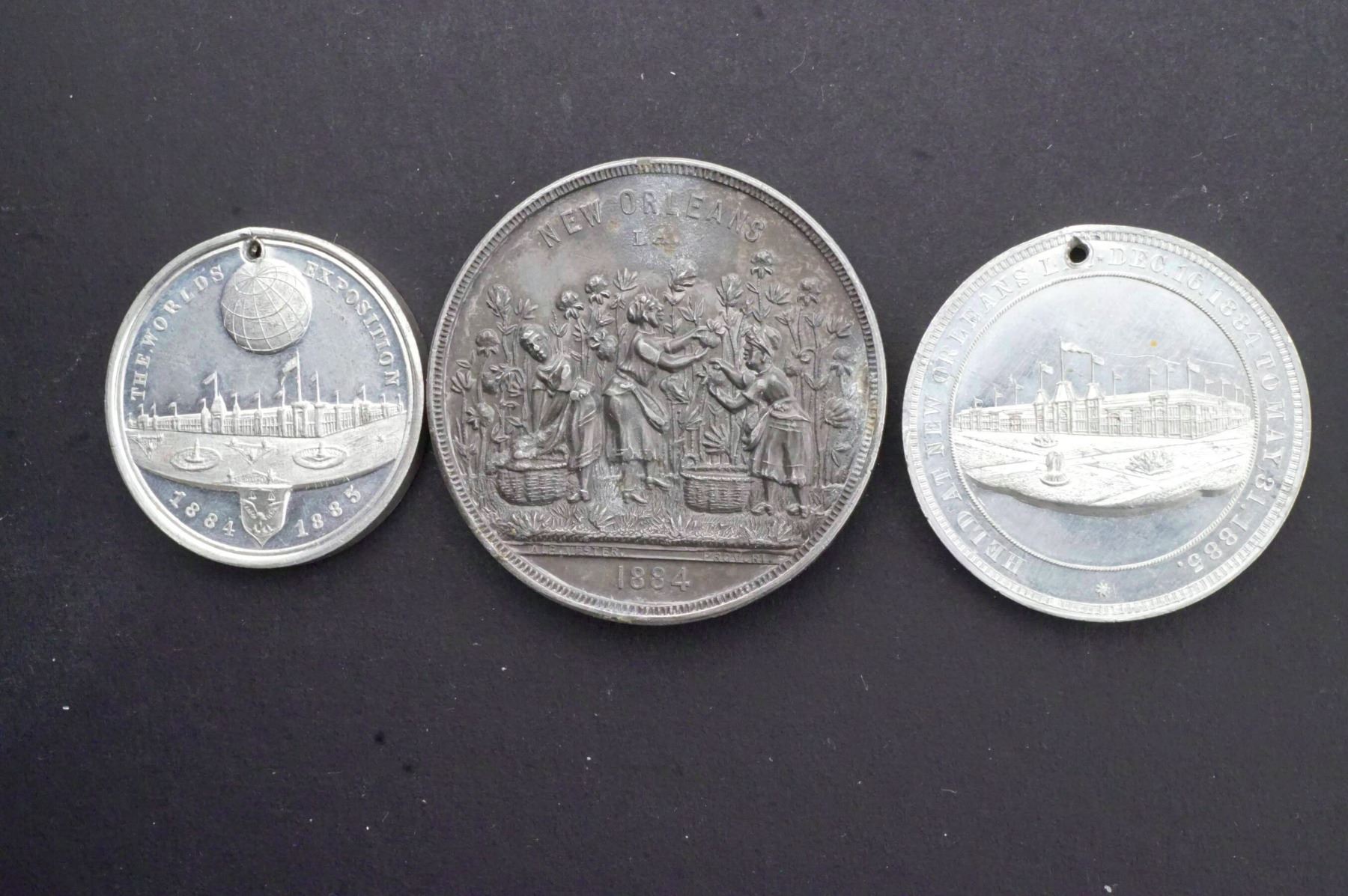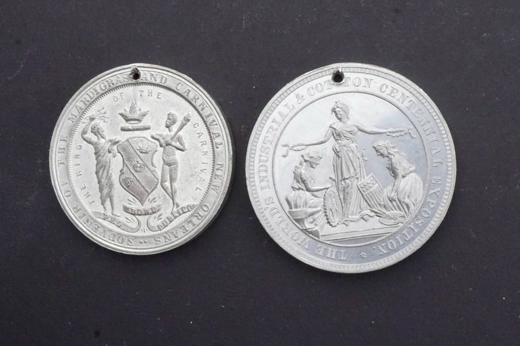 1) 43 mm, 36.4 grams. Darkened silver or silver plate.Obverse: Globe of the Earth, with New Orleans at center, and roads all leading there. To left, 1884. To right, 1885. Above: THE WORLD'S / INDUSTRIAL AND (and below) COTTON CENTENNIAL / EXPOSITION. Directly above the globe the letters "J. A. D" are counter stamped. The reverse depicts three women picking cotton. Above: NEW ORLEANS. Below: 1884. 2) 35 mm, 14.4 grams. Aluminium pierced for suspension. Standing woman placing wreaths on seated Industry and Art. Reverse: Exhibition Hall. 3) 32 mm, 10.8 grams. Aluminum.Pierced for suspension. Obverse also celebrates Mardi Gras / Carnival.