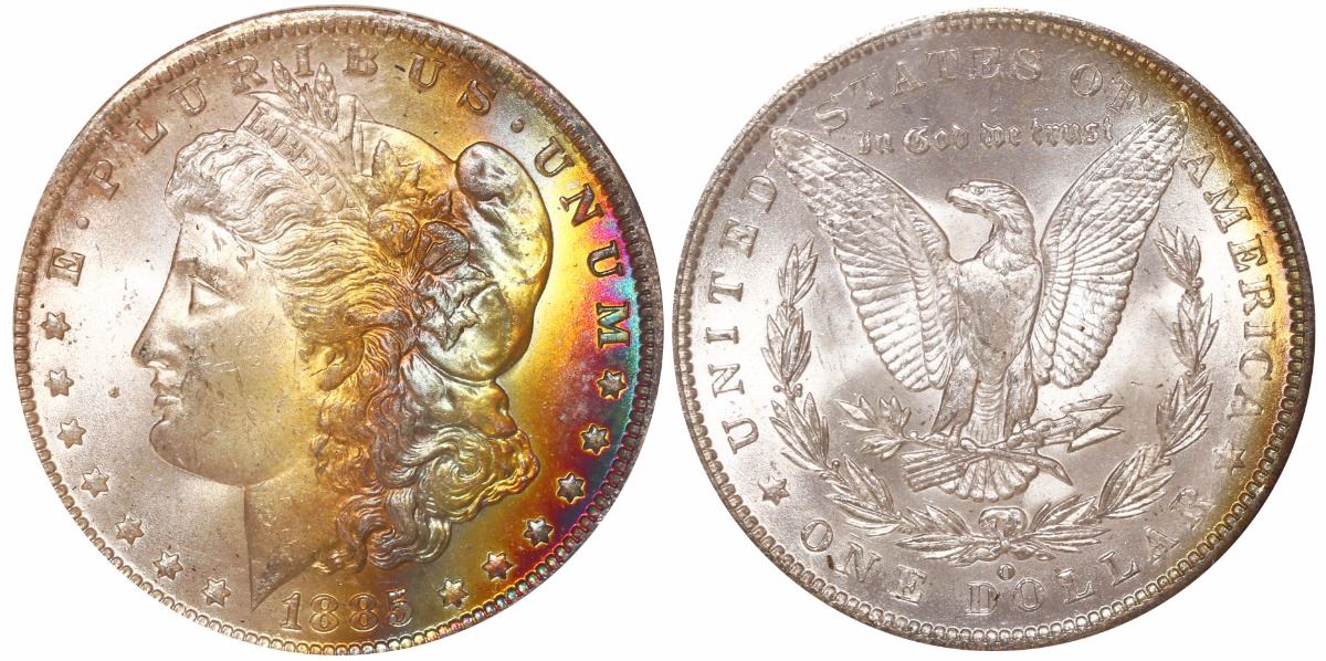 USA (New Orleans mint), $1 Morgan, 1885-O, encapsulated NGC MS 65* (star designation) with CAC sticker. KM-110. Lustrous satin fields with just a few minor bagmarks (also on cheek), with vivid rainbow toning on half of obverse and near rim on reverse.