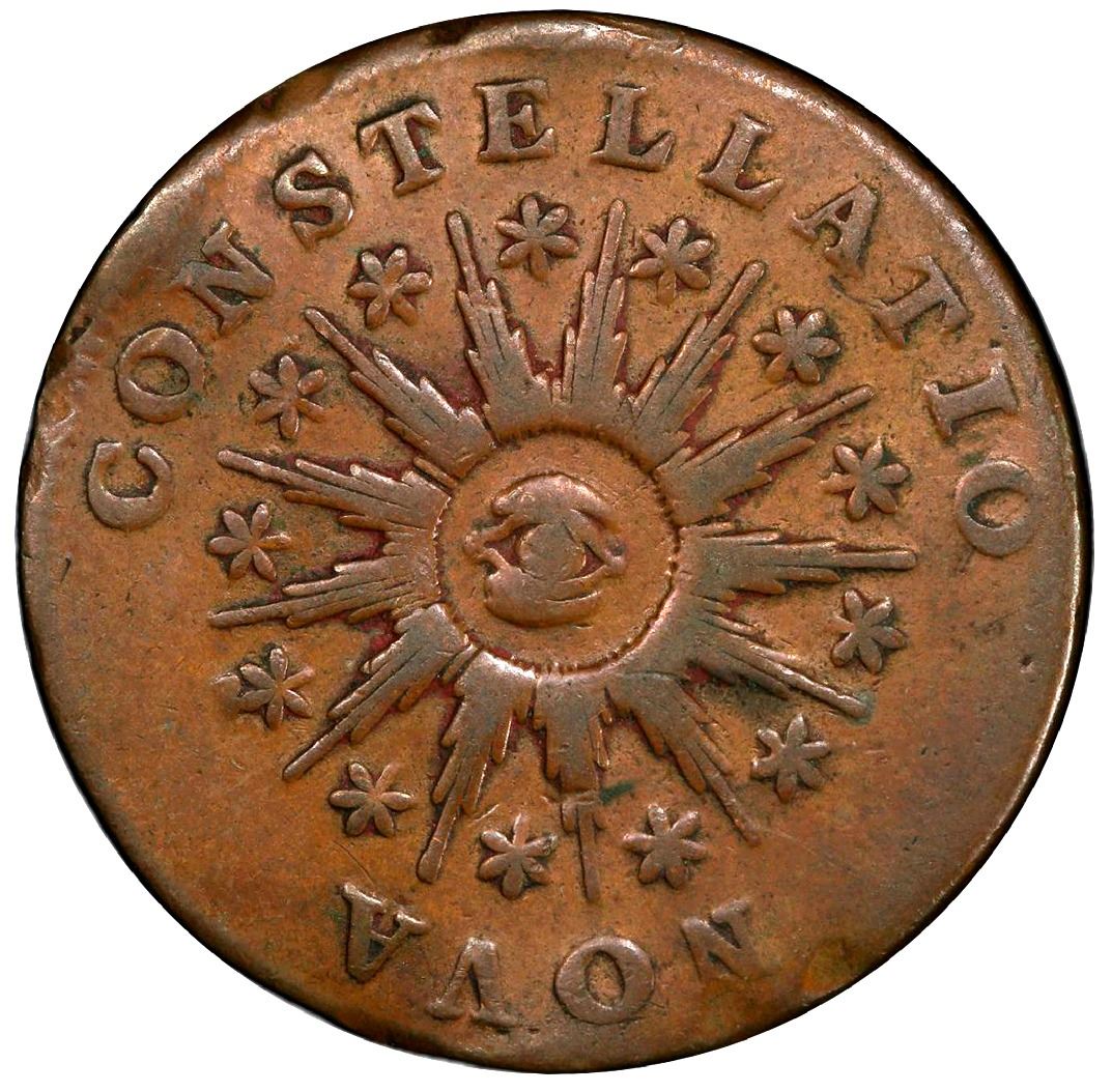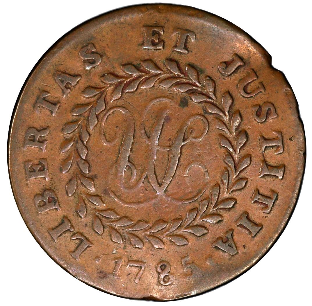 USA, Nova Constellatio copper, 1785, pointed rays, large date, PCGS Genuine VF details / damage. Very popular post-colonial issue with a bold design, some edge damage. CPG value (in VF 20): $585. Please use this link to verify the certification number